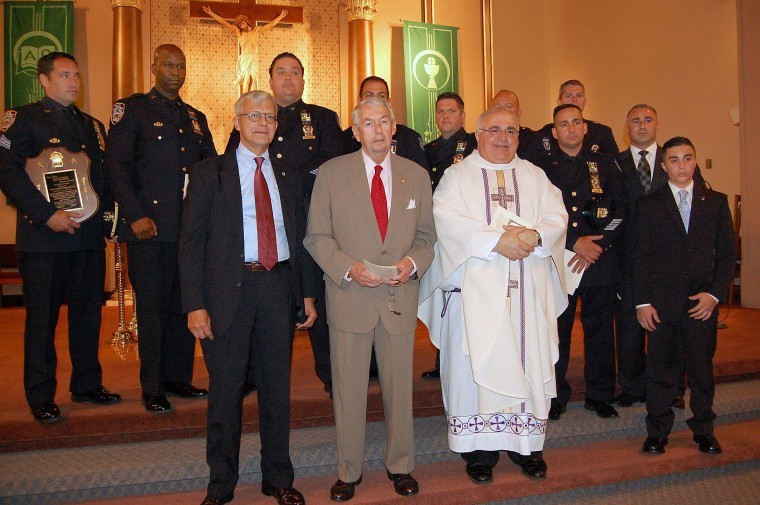 Kings County District Attorney Charles Hynes, Police Department Chaplain Monsignor Robert Romano and his grandnephew, retired Brooklyn Assistant District Attorney Joseph Petrosino, were among those in attendance at the special ceremony held at the 15th Avenue church, in which Petrosino Memorial Medals were presented to the families of retired NYPD Bomb Squad Detective Tony Senft, who was badly injured in an FALN bombing in 1982, and Detective Claude Richards, who was killed during the terrorist attacks on September 11, 2001.