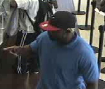 The suspect is described as a muscular black male in his 40s, standing around 5’9″ to 5’10” tall, with medium complexion, a black baseball cap with red trim, a light blue Polo shirt, black shorts and white/black sneakers.
