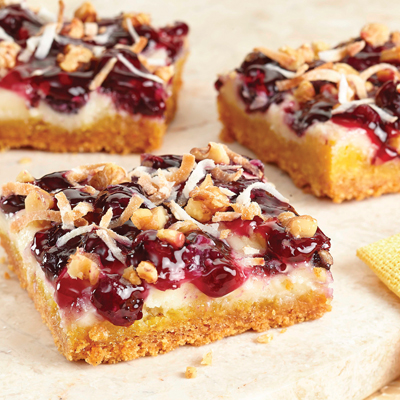 - Beat cream cheese until fluffy in large mixing bowl. Add remaining 2 eggs and confectioners’ sugar. Pour over cake mixture in pan, spread blueberry fruit filling on top and sprinkle with coconut and nuts.