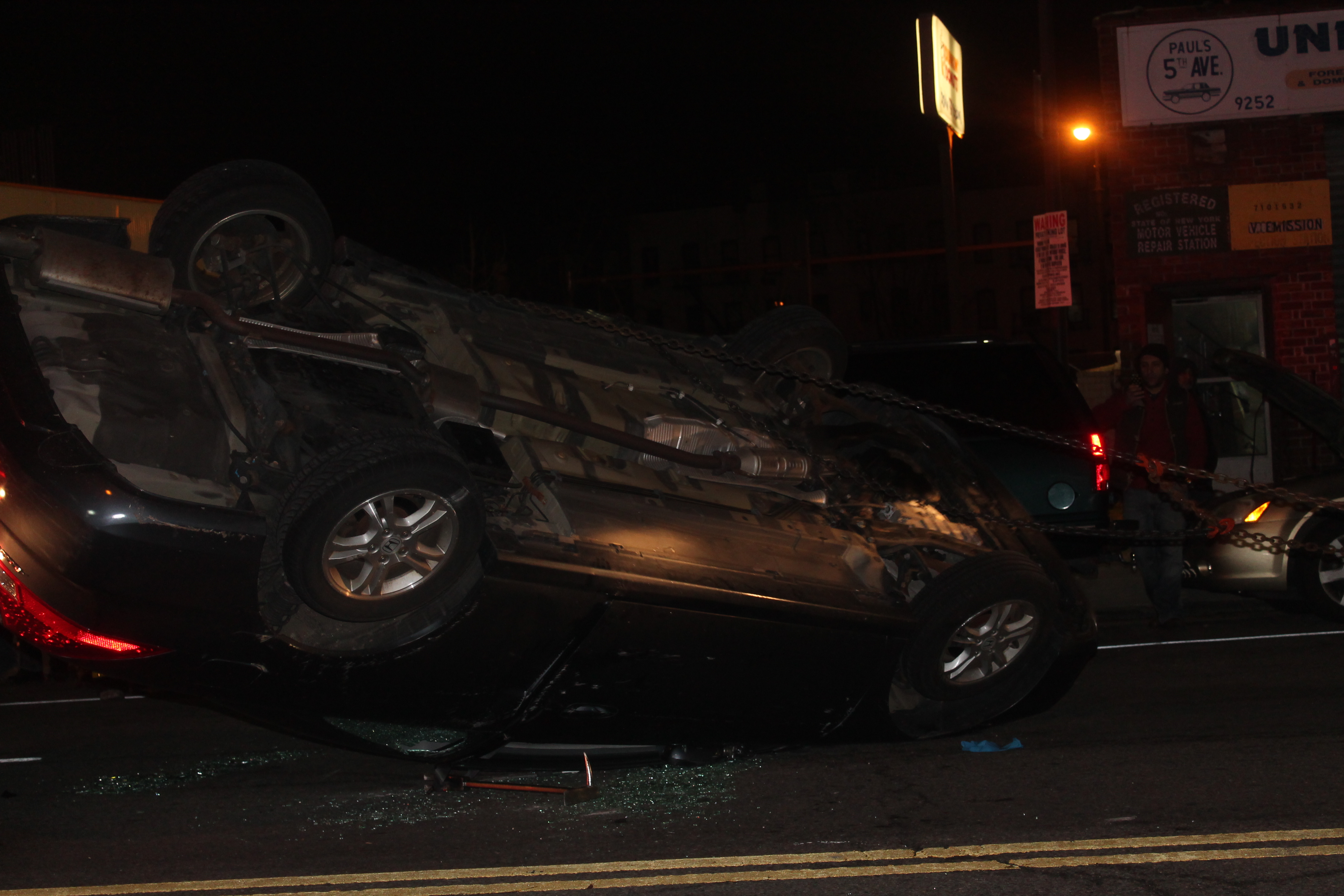 A car accident occurred on Thursday, December 11, at around 5 p.m. outside Dunkin Donuts at 92nd Street and Fourth Avenue. Witnesses claim the car was driving down the avenue when the driver clipped a parked truck, causing it the flip over. The FDNY arrived at the scene immediately. The damage to the parked truck appeared limited.