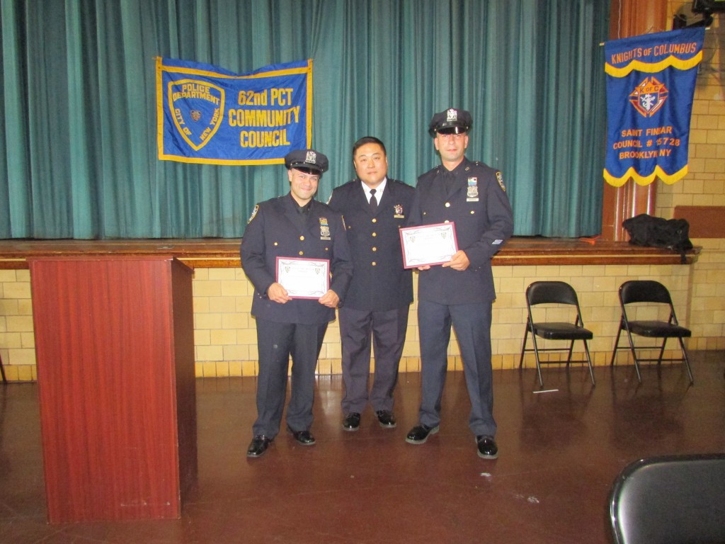 NYPD Officers Jason Schiavone and Pavel Mashkov of the 62nd Precinct were awarded Cop of the Month honors at the Tuesday, June 16 62nd Precinct Community Council meeting.