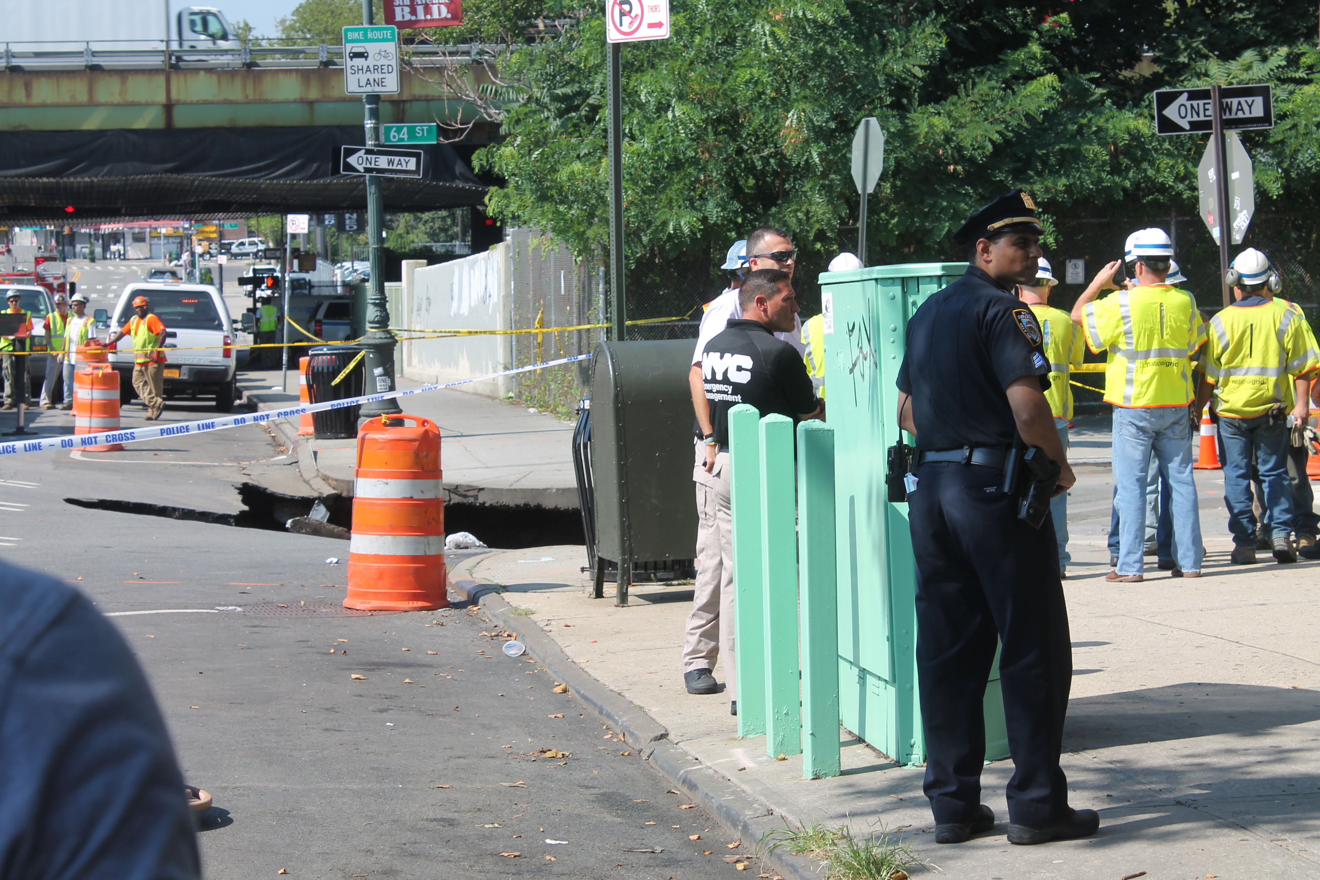 Cops and firefighters have been on the scene since 7 a.m. this morning at the site of a massive sinkhole near 64th Street and Fifth Avenue in Sunset Park.