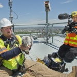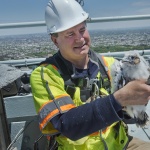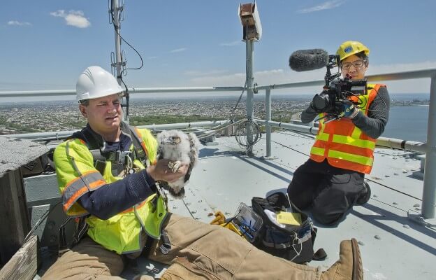 Every year, research scientist Chris Nadareski of the New York City Department of Environmental Protection climbs to the top of the bridges to put identifying bands on the falcon chicks. The bands help the department keep track of the number of peregrines in the city, and identify them if they become sick or injured.