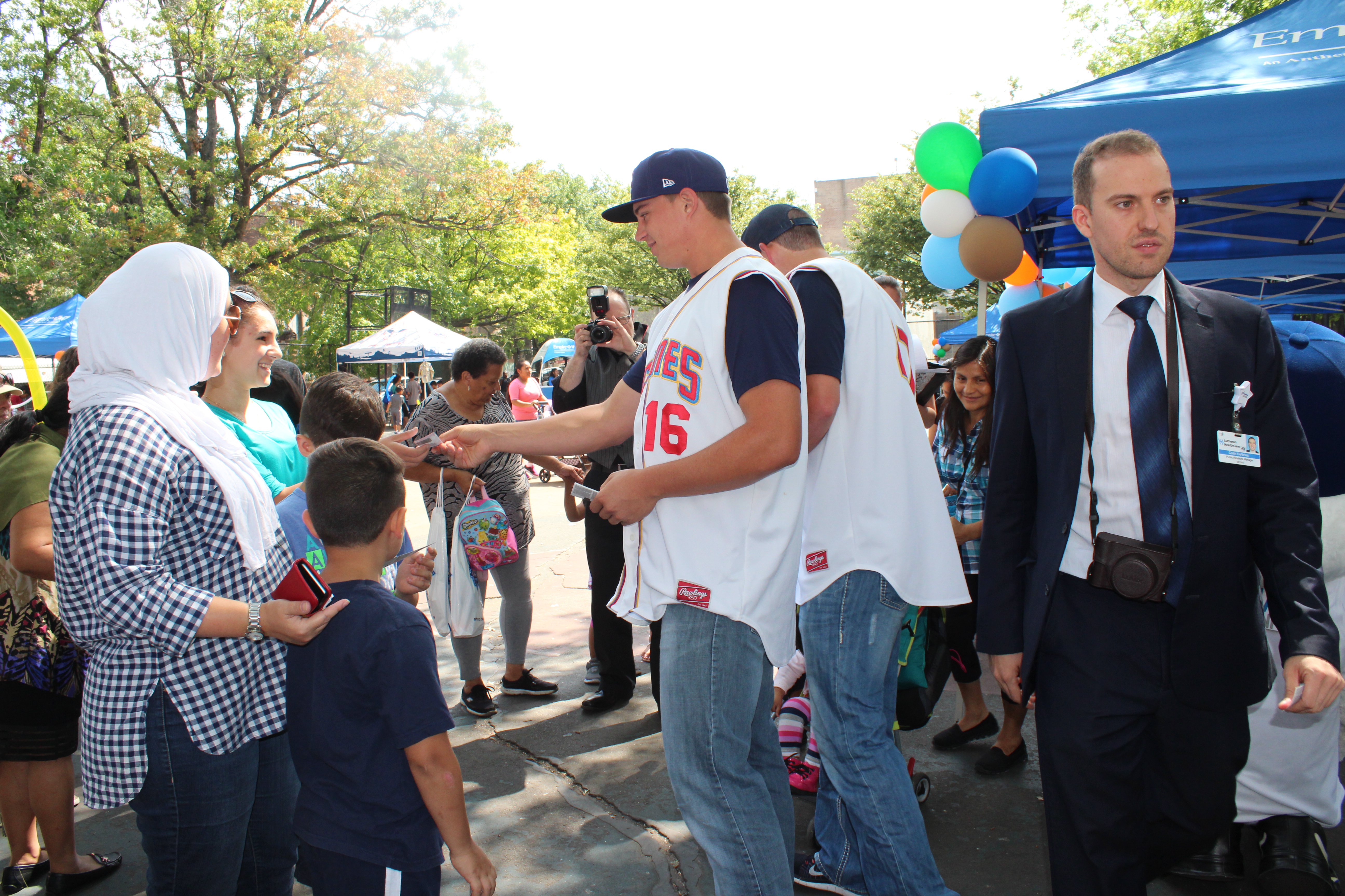 Families lined the length of the playground in anticipation of their share of the free school supplies being distributed. Costco Wholesale contributed a multitude of brightly-colored backpacks filled with academic essentials. The Brooklyn Nets sponsored the back-to-school blast by providing pencil cases, rulers and pens. The strongest sponsor presence was from the Brooklyn Cyclones, who aside from donating notebooks, hats and pens, actually came to the park to greet the children, get involved, and hand out complementary tickets and baseball cards. The Cyclones’ mascot, Sandy the Seagull, stole the show by capitalizing on photo opportunities with the children.