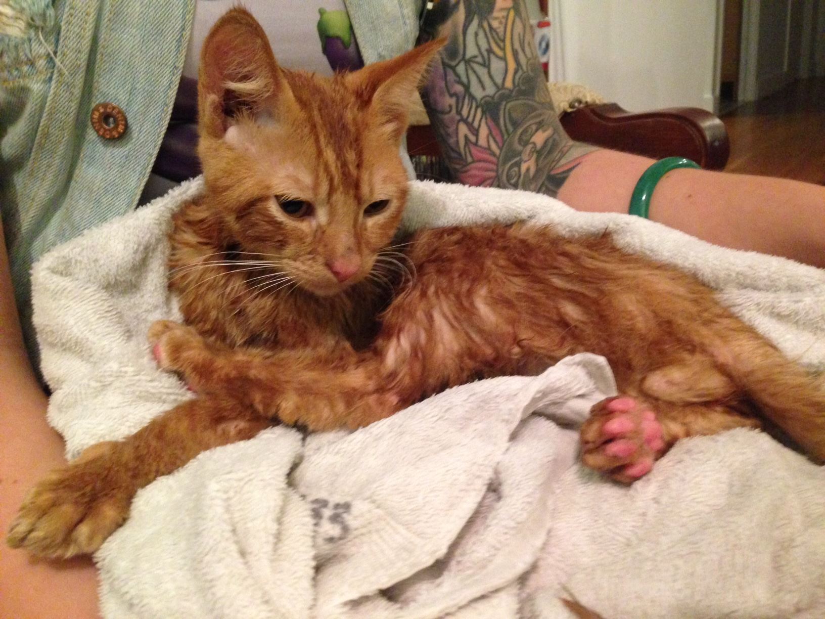 I just found this stray kitten. It walked up to me and my pups like it was part of the pack. Cuddled with both dogs, and my legs before climbing up onto my lap, and letting me rub its belly. It’s the most affectionate, dog-like cat I’ve ever known. It’s a boy, maybe six months old, didn’t have a collar, was really dirty, and pretty hungry. It’s been bathed (actually seemed okay with that), fed, and is safe for the night.
