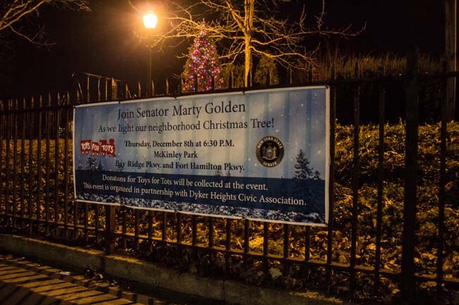 Local residents, young and old, gathered that evening at William McKinley Park, located at the intersection of Bay Ridge and Fort Hamilton Parkways, for another local tree lighting, this one sponsored by State Senator Marty Golden in cooperation with the Dyker Heights Civic Association.