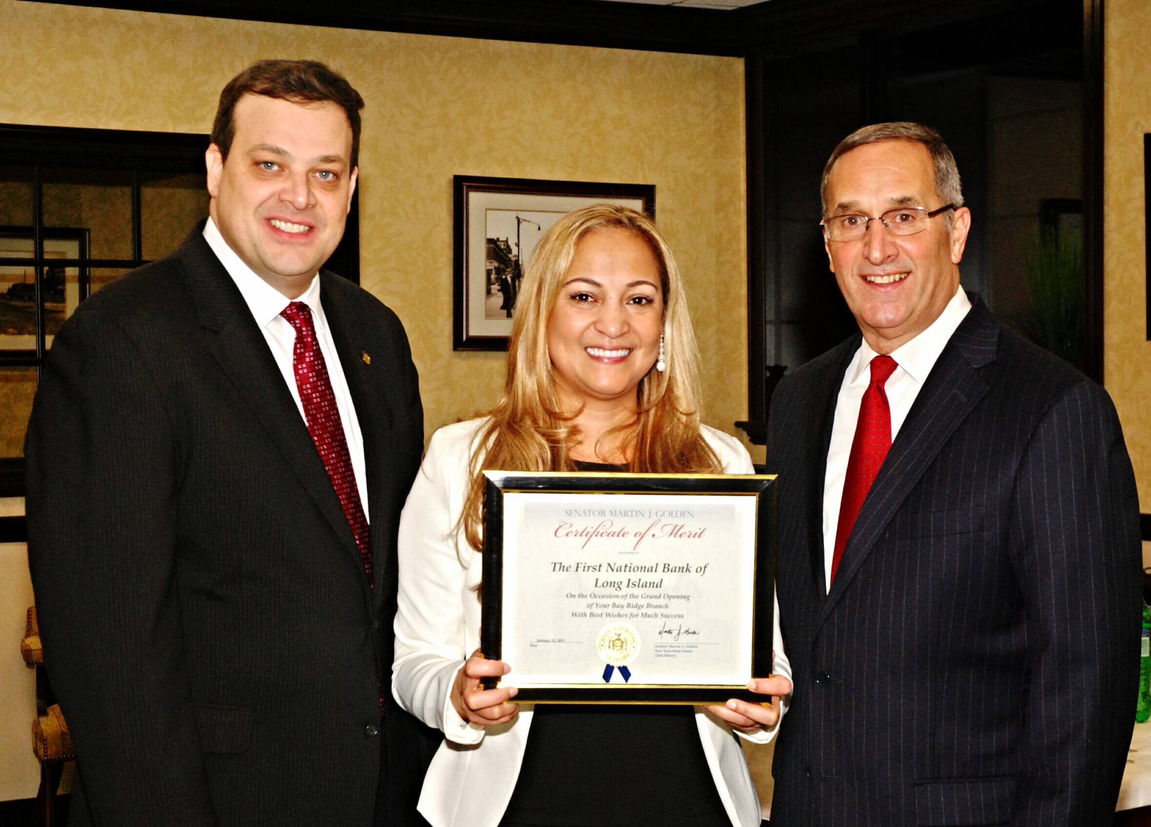 The night also had appearances by Deputy Chief of Staff for State Senator Marty Golden John Quaglione, and Senior Vice President of the Brooklyn Chamber of Commerce Rick Russo, who helped Branch Manager Yajaira Estevez hold the big scissors for the ribbon cutting. Quaglione also presented a Certificate of Merit to Estevez and wished her good luck in the bank’s new home.
