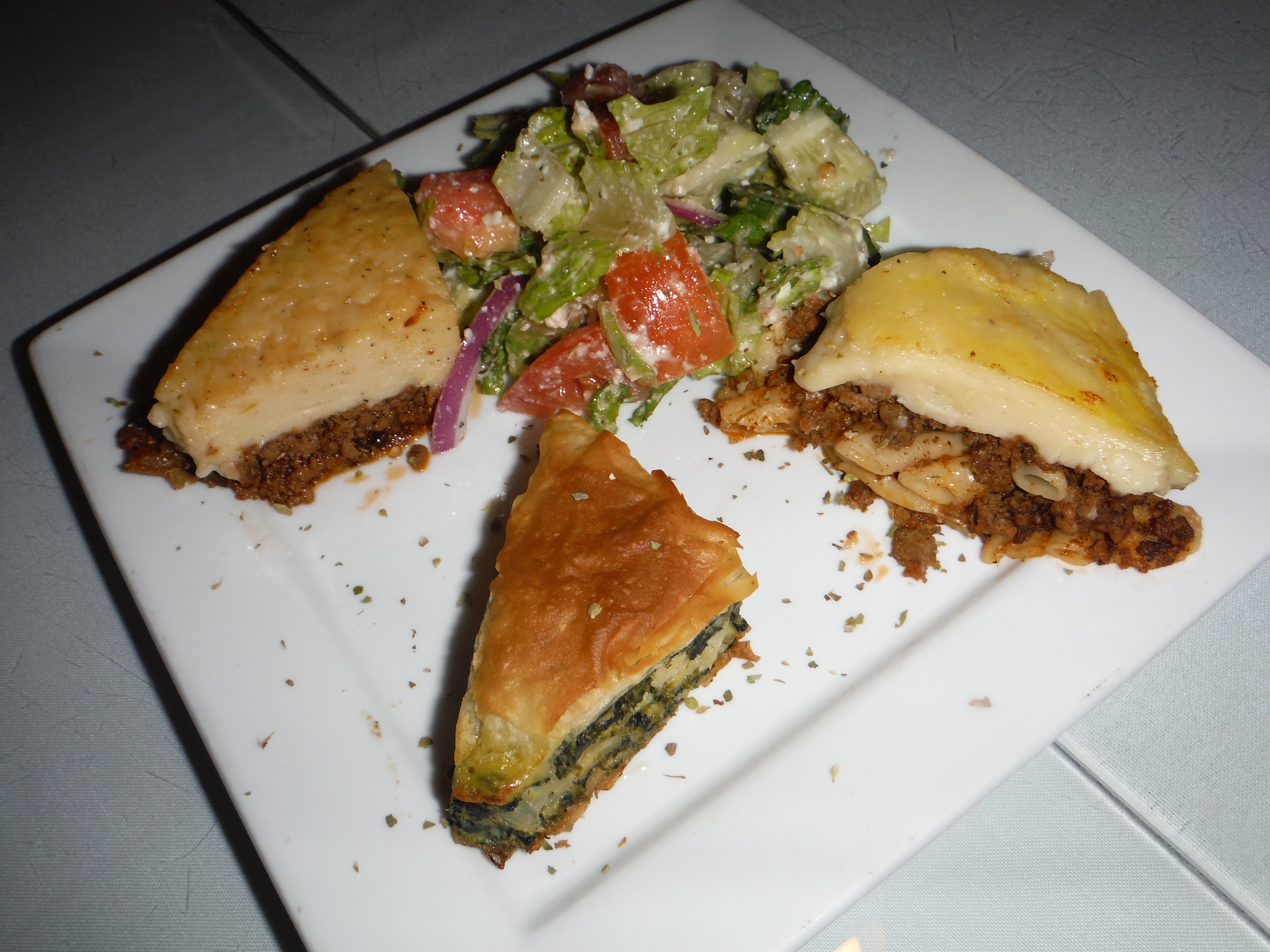 We also tasted the delightfully tart and lemony Avgolemono Soup ($4.95, cup; $6.95, bowl), pale yellow and studded with chicken bits and rice for quintessential comfort food, before moving on to the Spartan Combo ($16.95), which combines Pastitsio, Moussaka, Spinach Pie and Greek Salad and which is available as a vegetarian option, as well as with meat.