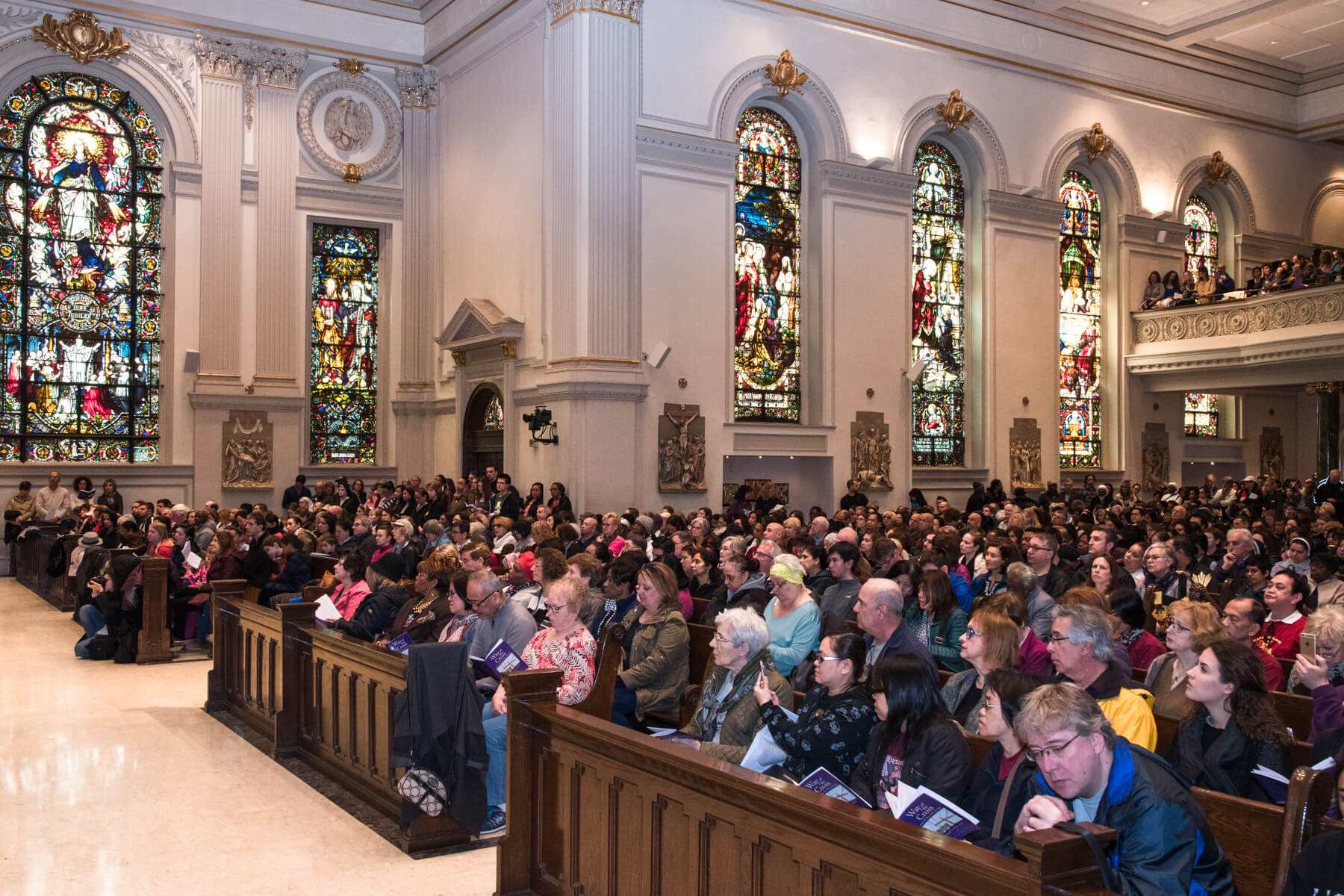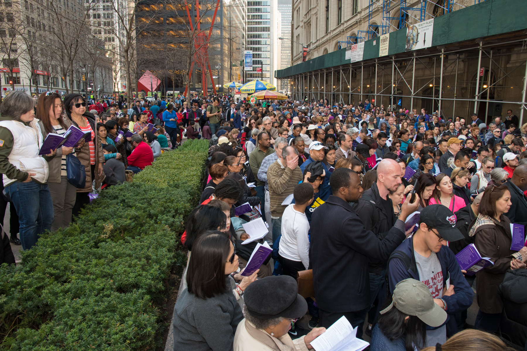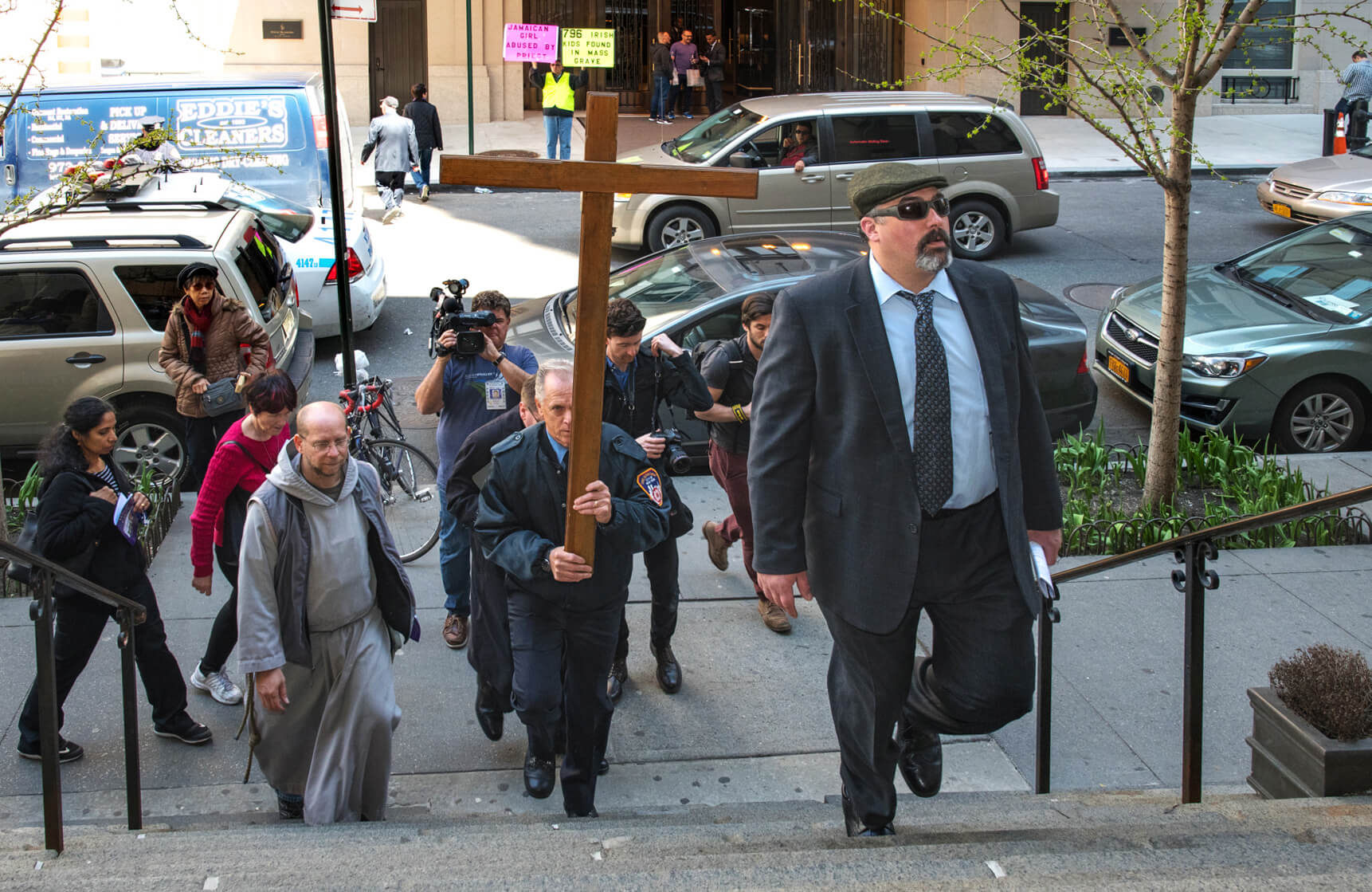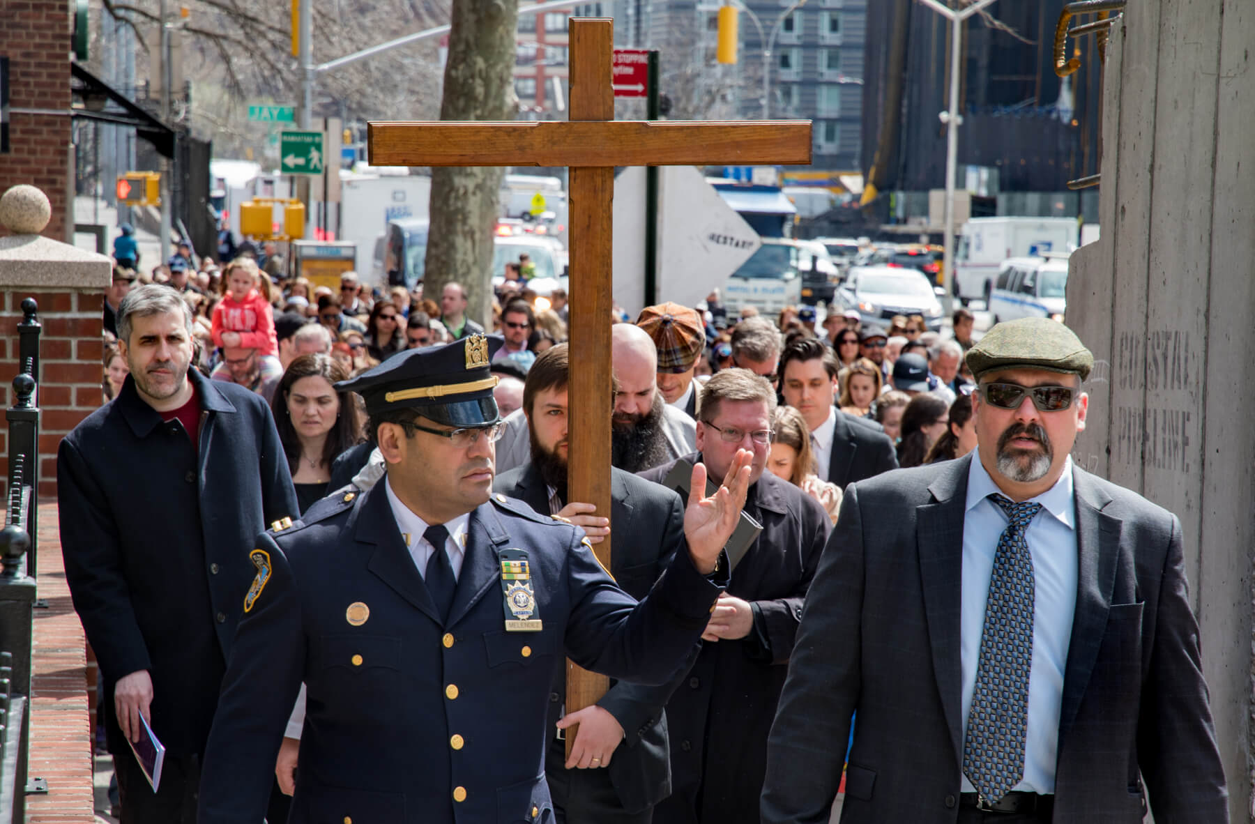 The day started with prayers and a greeting from current Bishop of the Diocese of Brooklyn Nicholas DiMarzio at St. James Cathedral-Basilica in Downtown Brooklyn. The procession then began and included readings of Gospel passages and choral music. Stops to hear the readings took place on the Brooklyn Bridge, as well as in City Hall Park and Zuccotti Park in Manhattan. The day concluded with prayers at St. Peter’s Church in the Financial District.