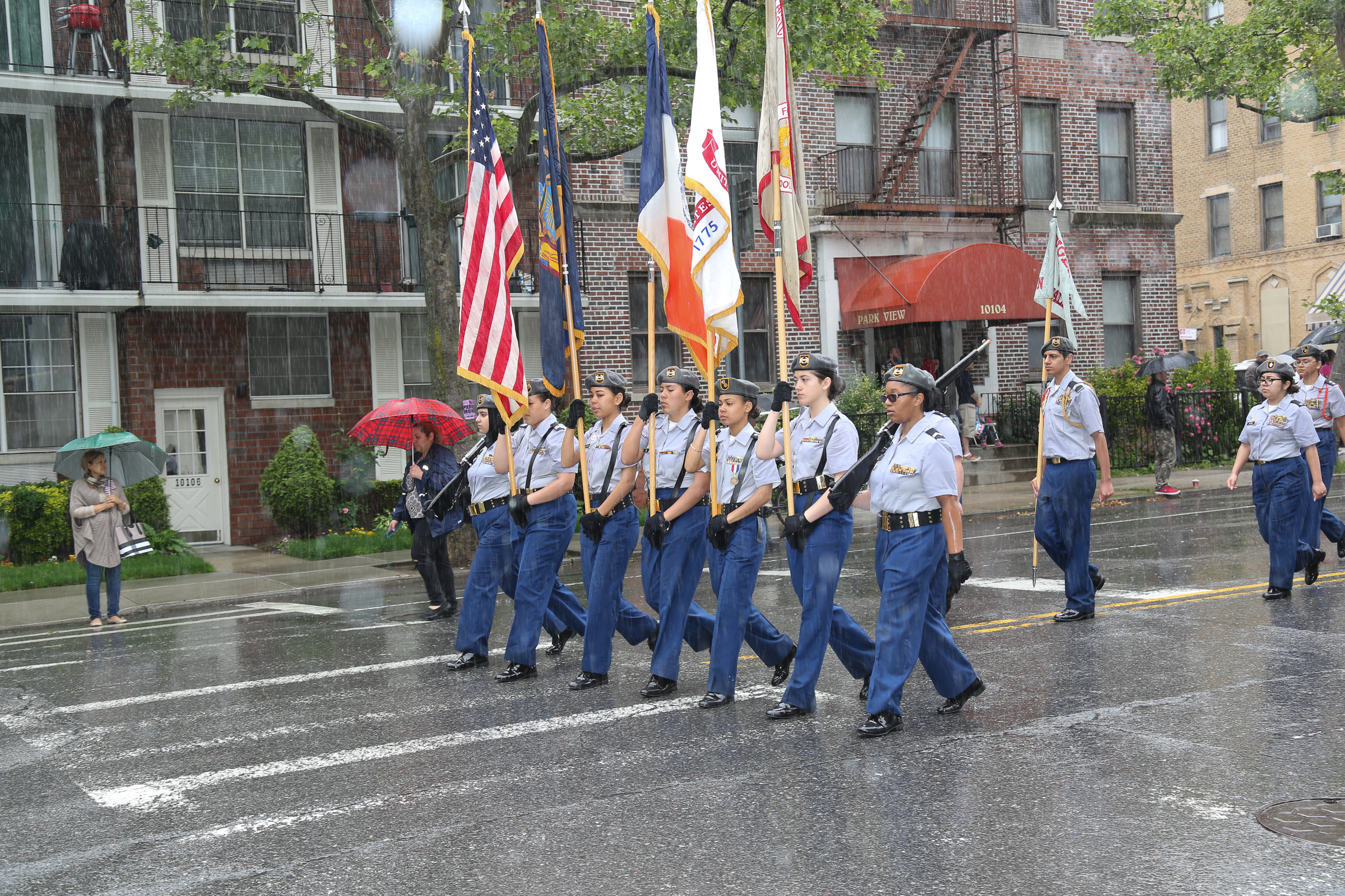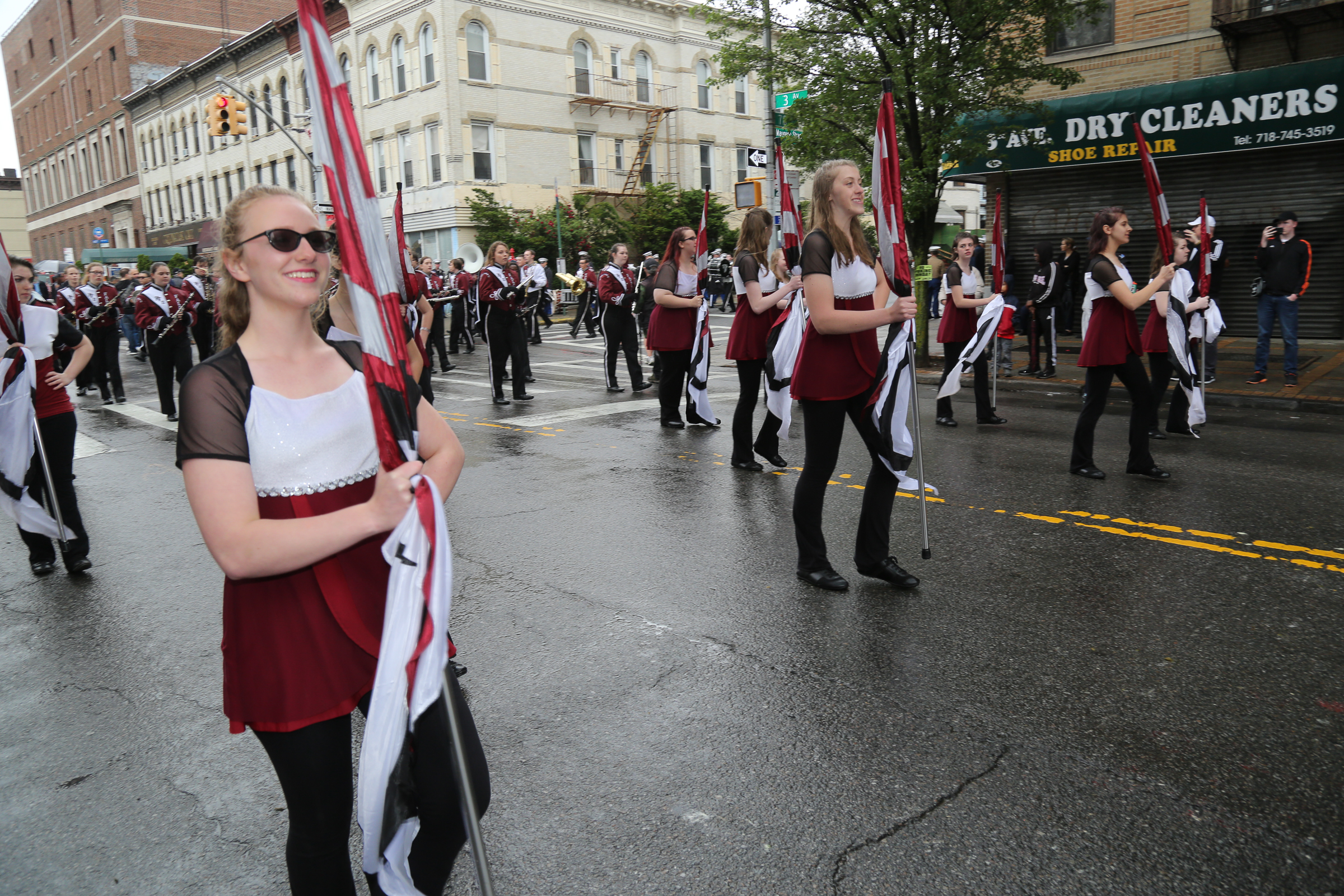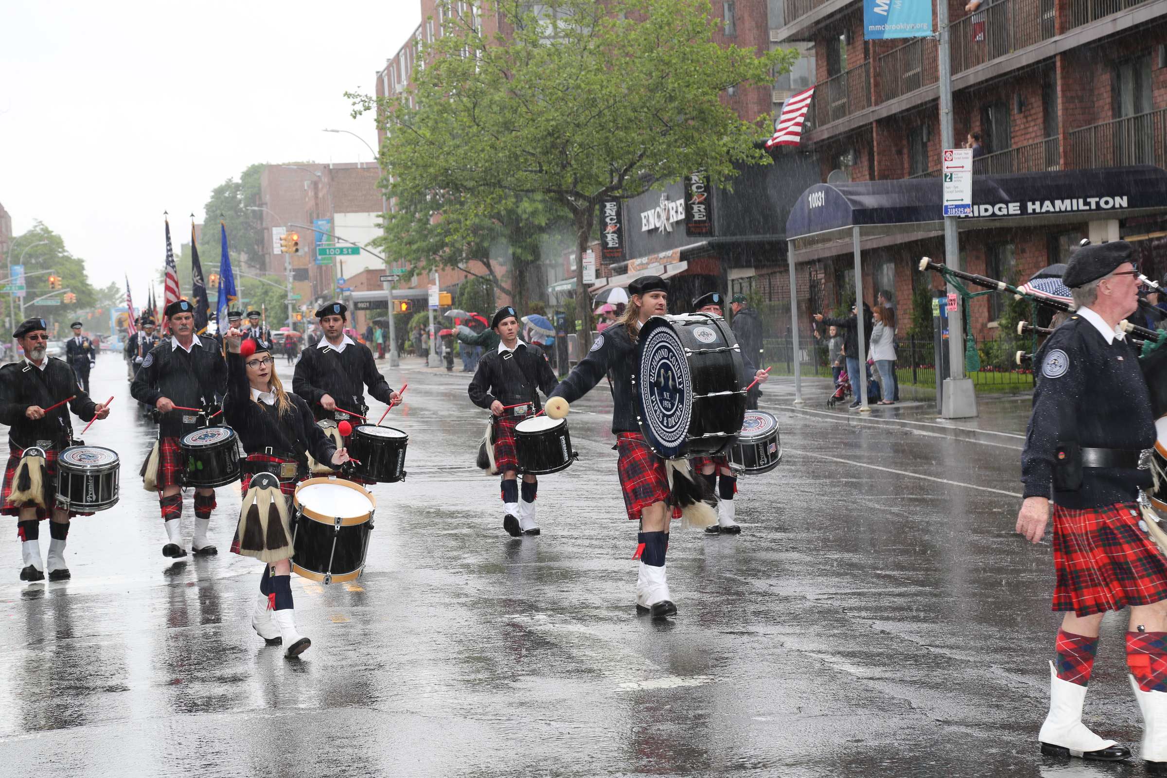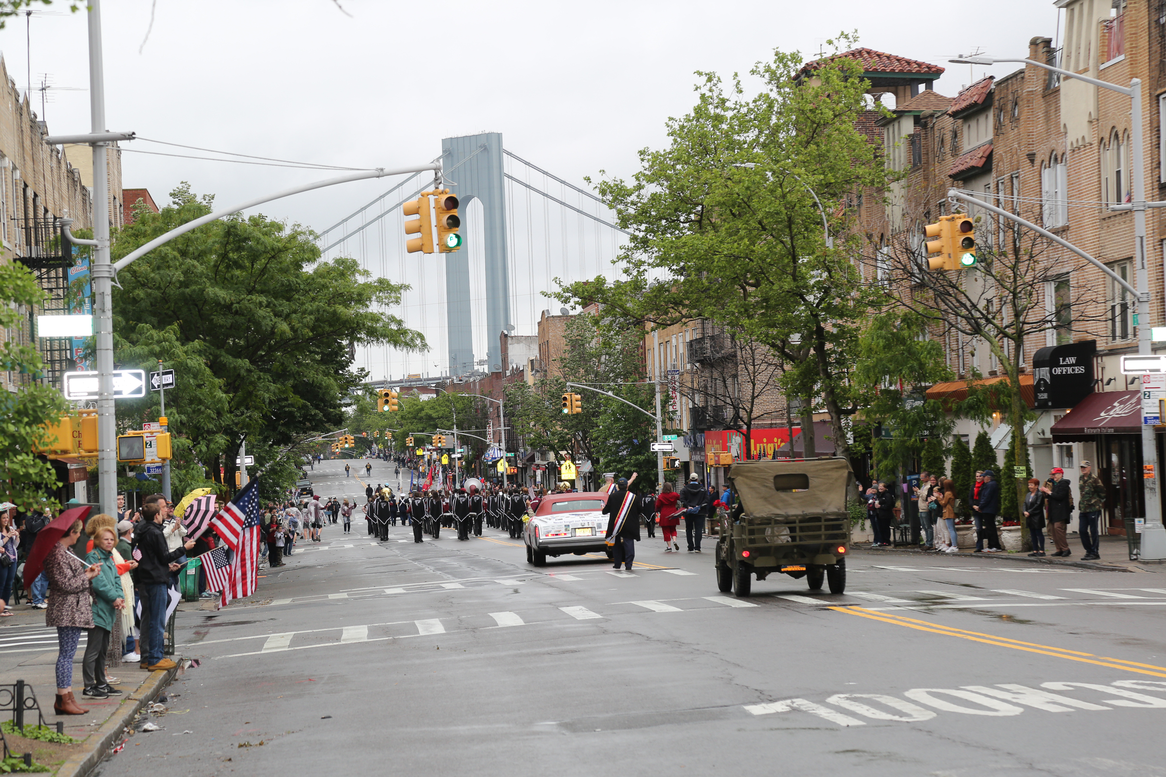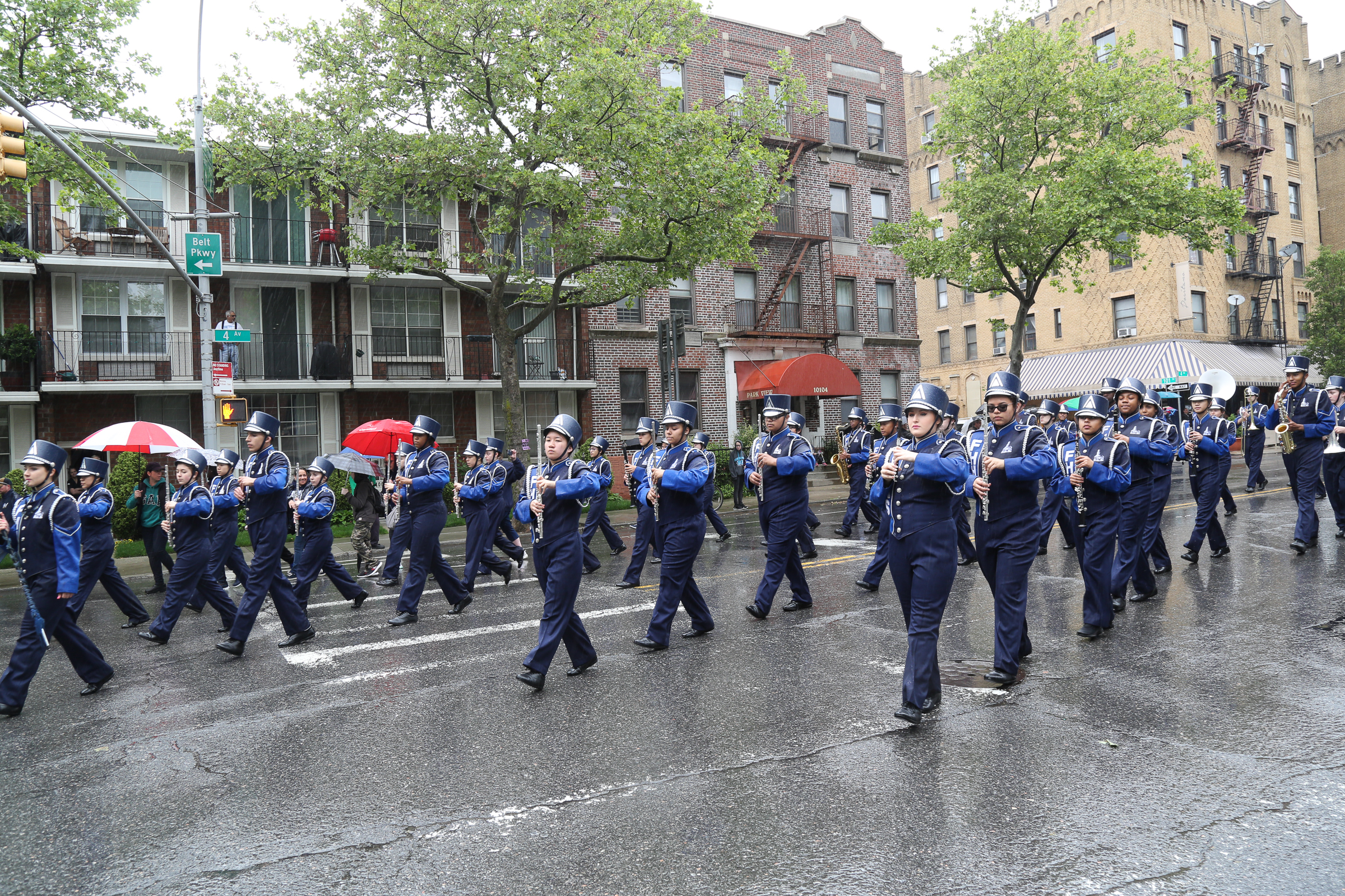 The morning of the milestone 150th annual Kings County Memorial Day Parade, one of its organizers, Bay Ridge resident Ray Aalbue, sent a text to Matt Schoenherr, band leader for a military marching band from Sterling, Michigan, saying “Just to let you know, we march rain or shine.”