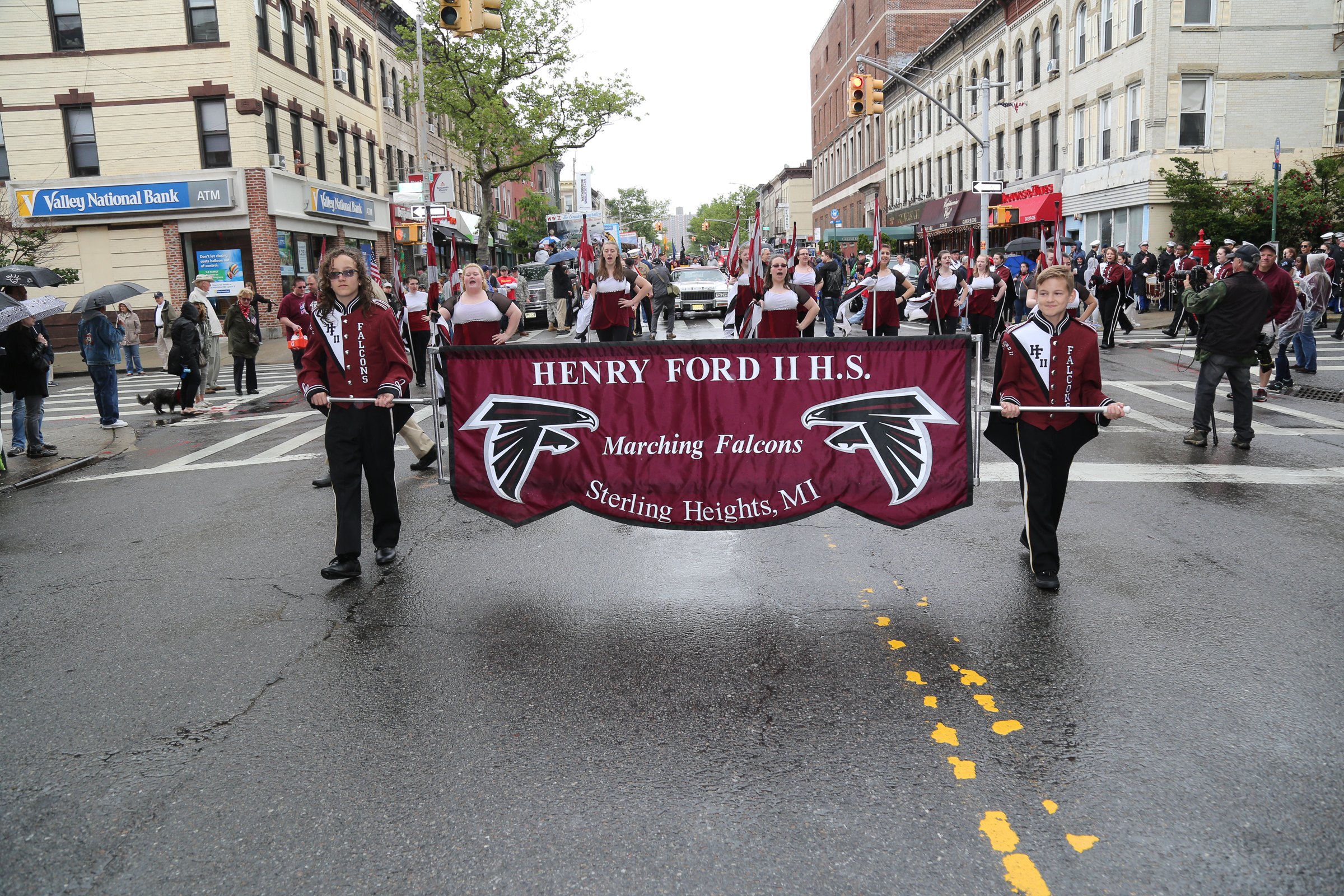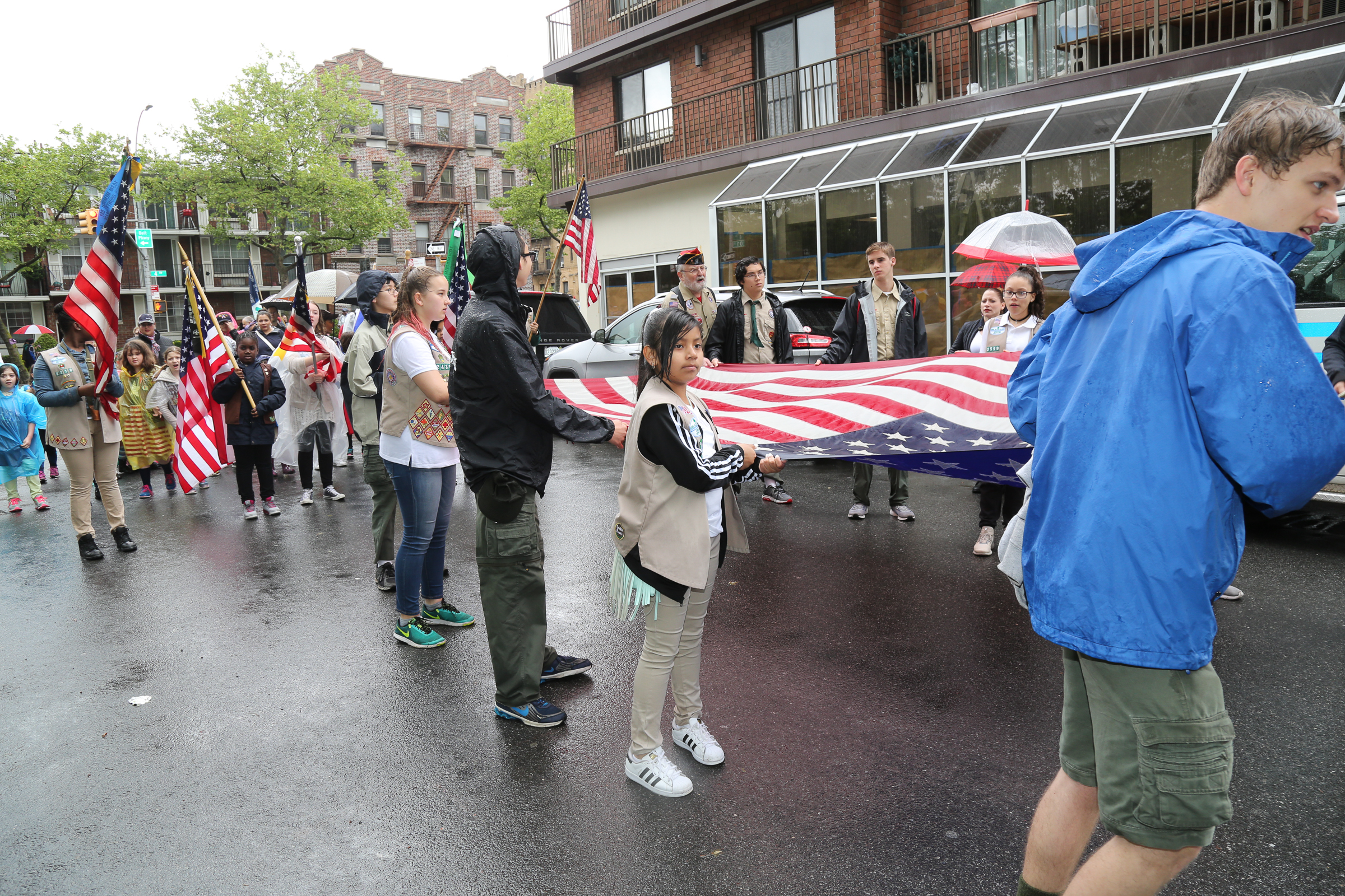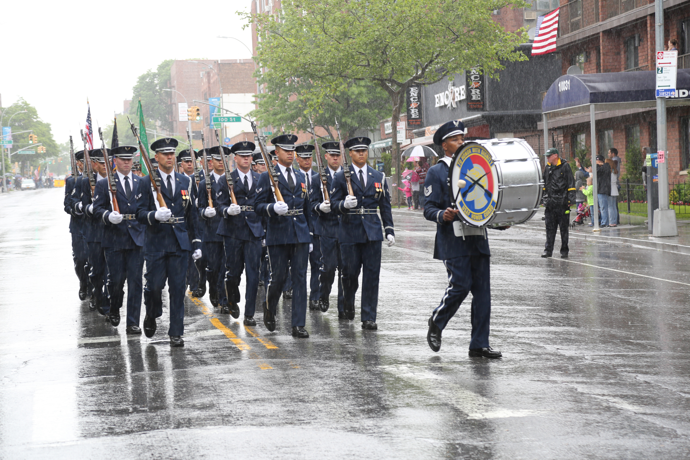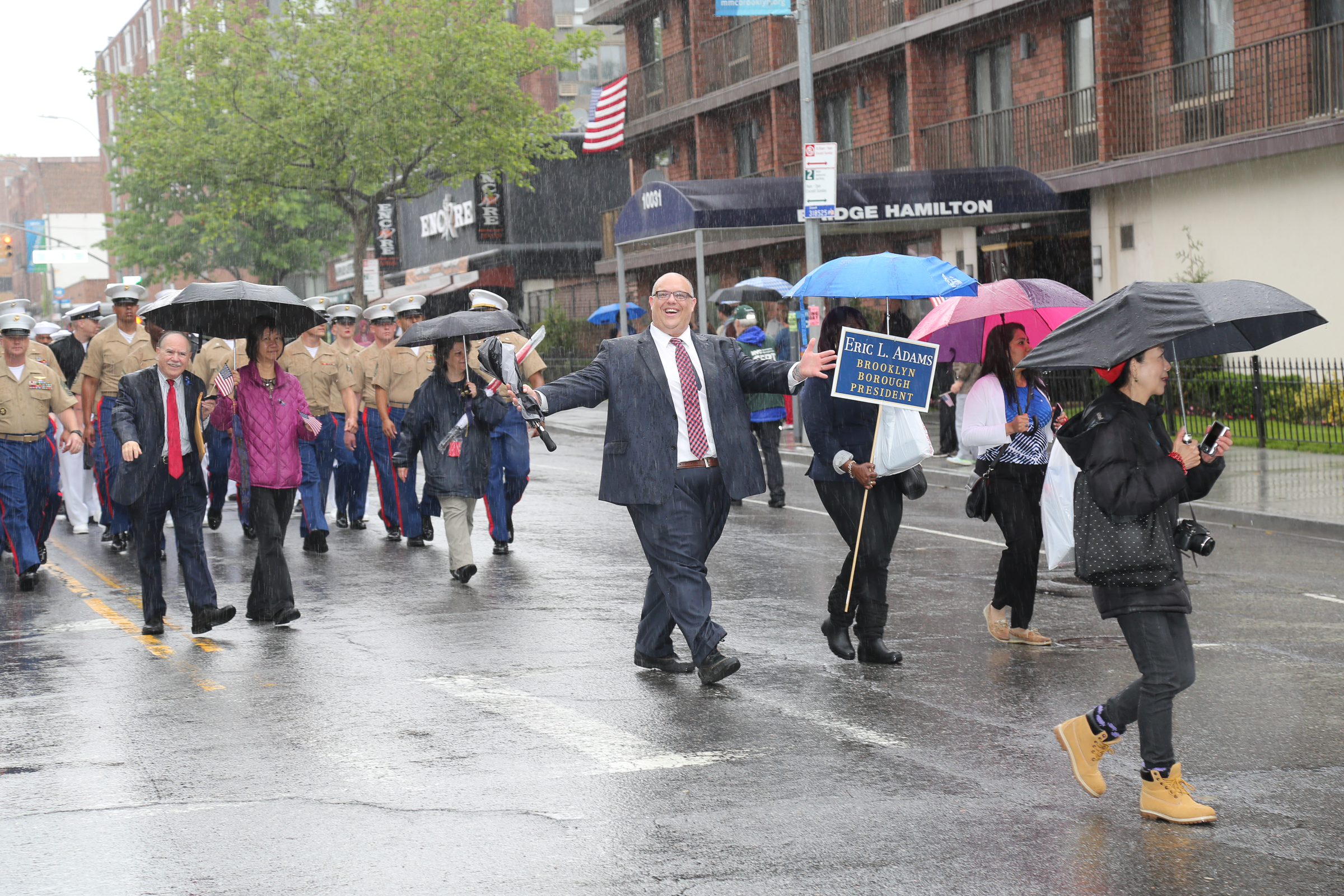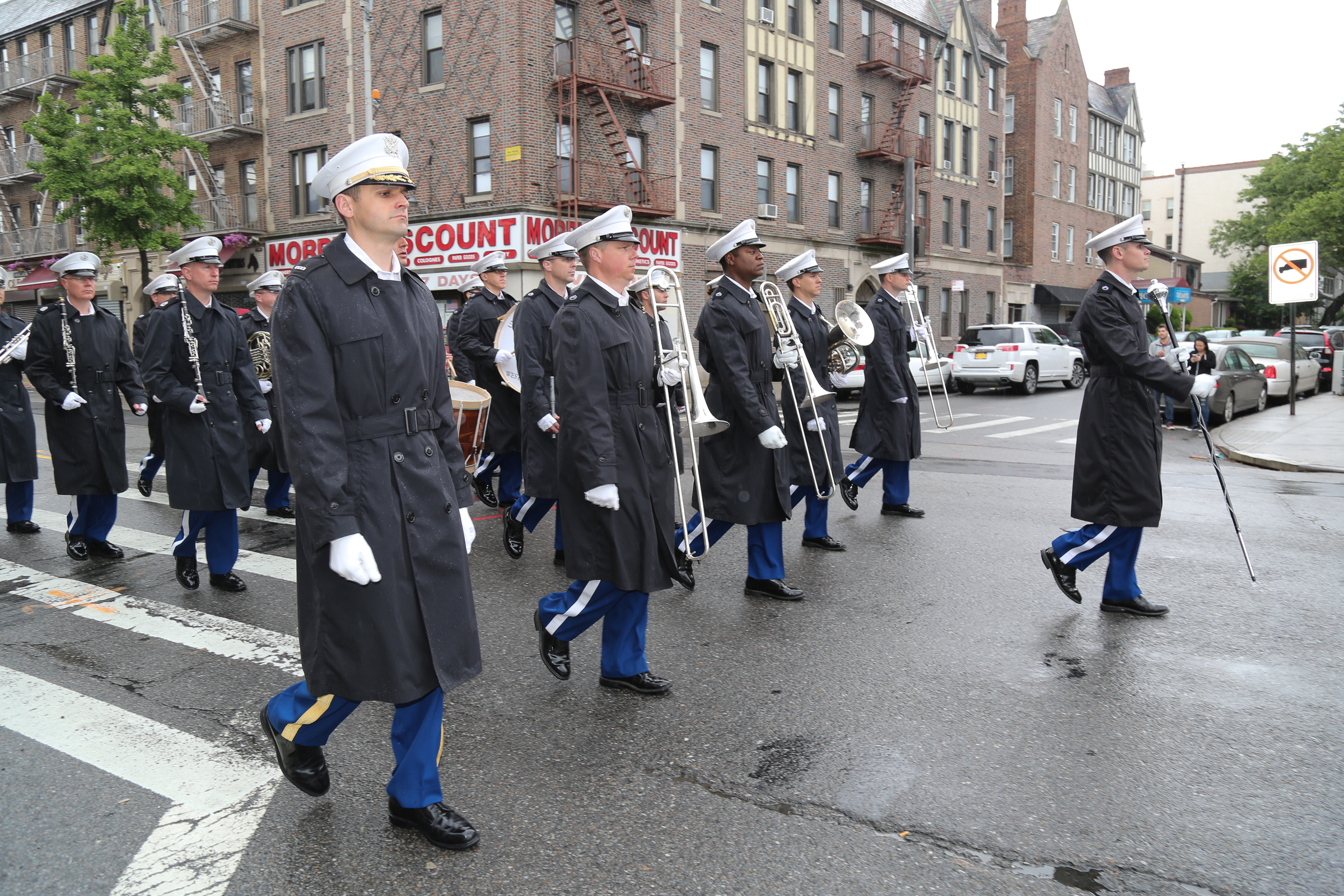The morning of the milestone 150th annual Kings County Memorial Day Parade, one of its organizers, Bay Ridge resident Ray Aalbue, sent a text to Matt Schoenherr, band leader for a military marching band from Sterling, Michigan, saying “Just to let you know, we march rain or shine.”