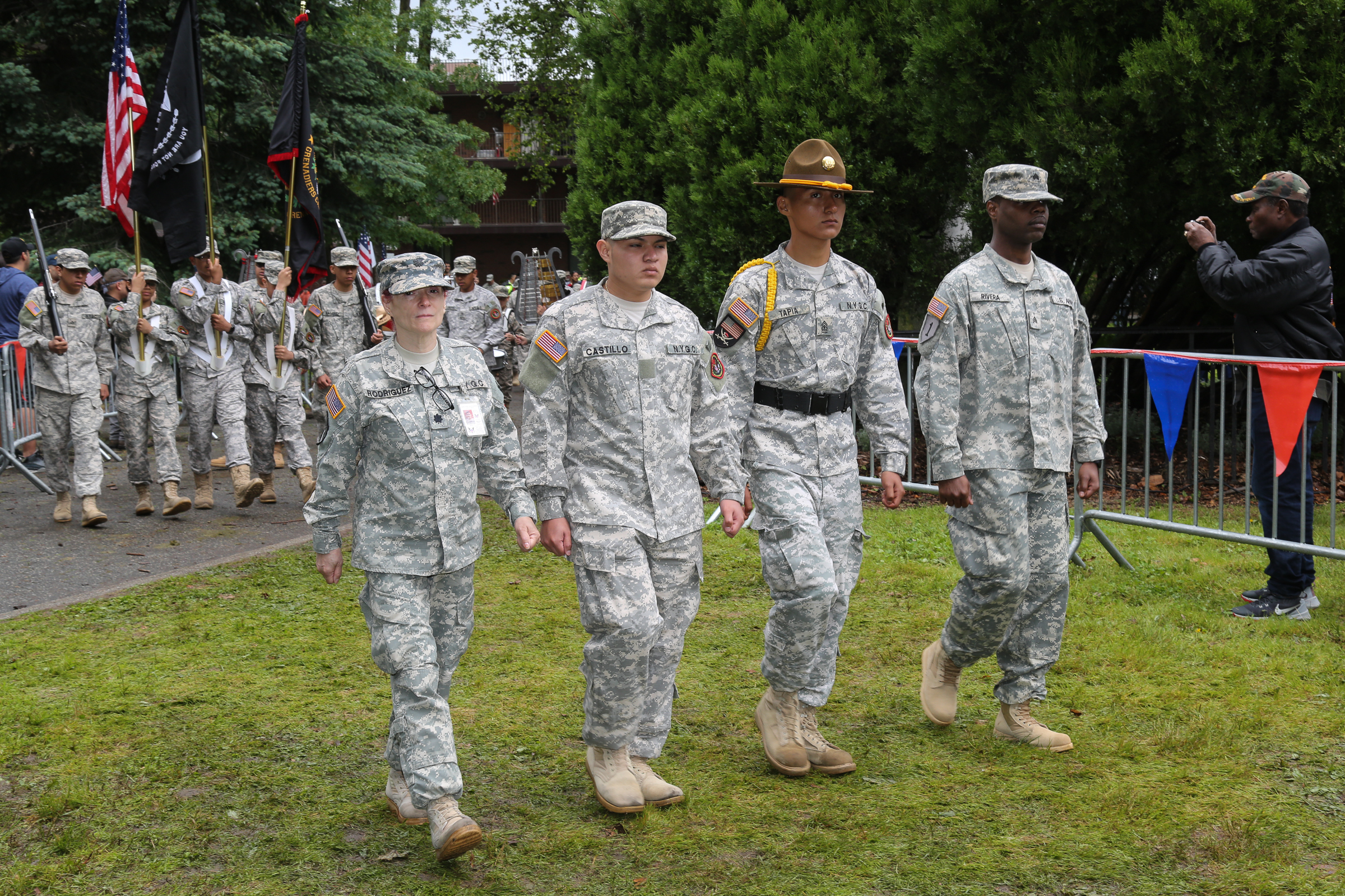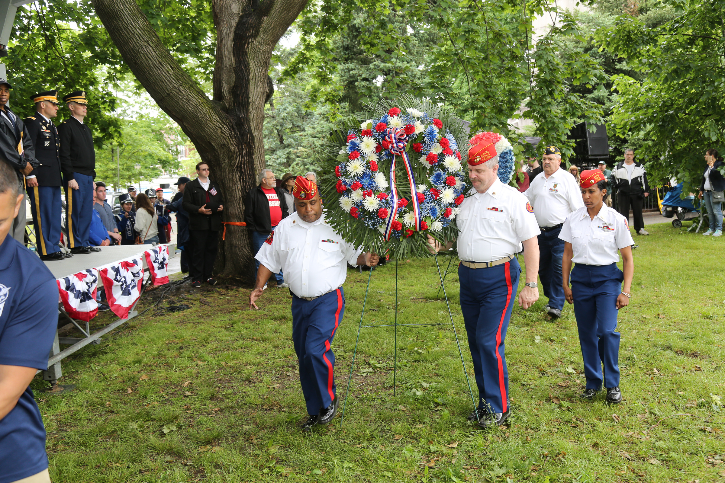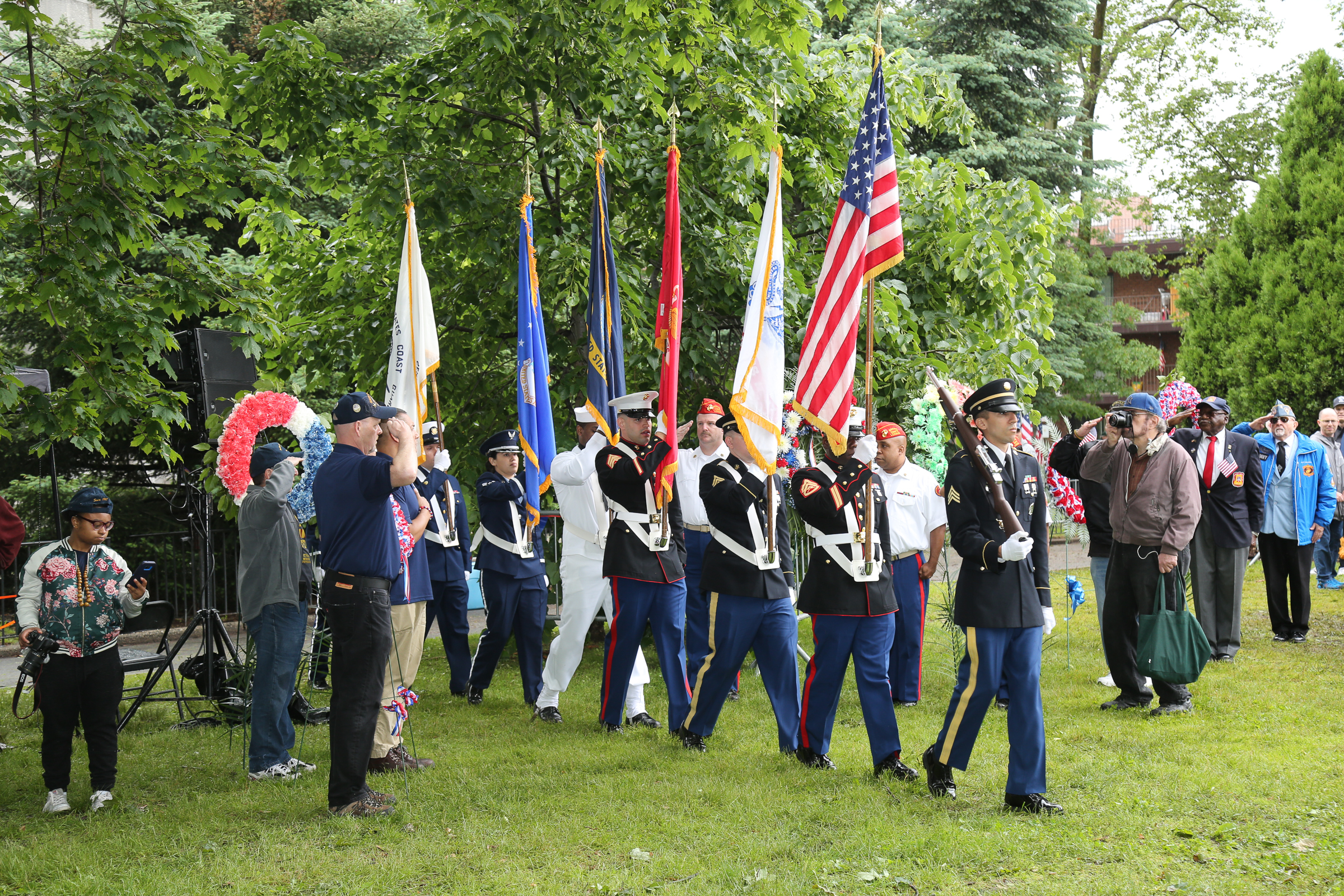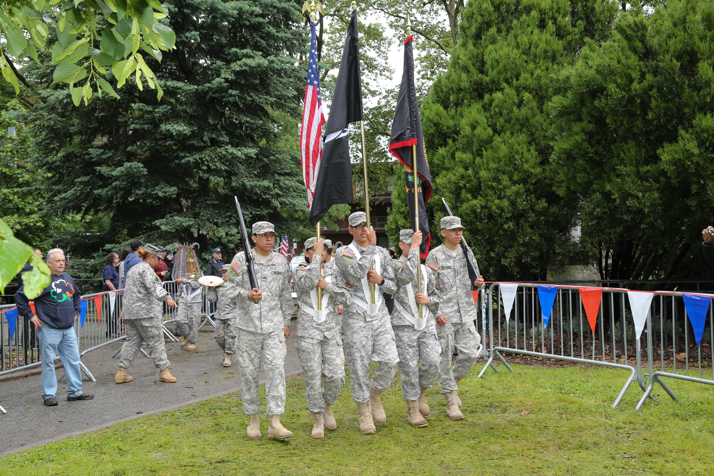 Following the parade was a memorial service inside “Cannonball Park” featuring a performance of the national anthem, as well as “God Bless America,” by former 68th Precinct NYPD Officer Daniel Rodriguez. The program also included wreath layings and a 21-cannon salute by the Veteran Corps of Artillery.