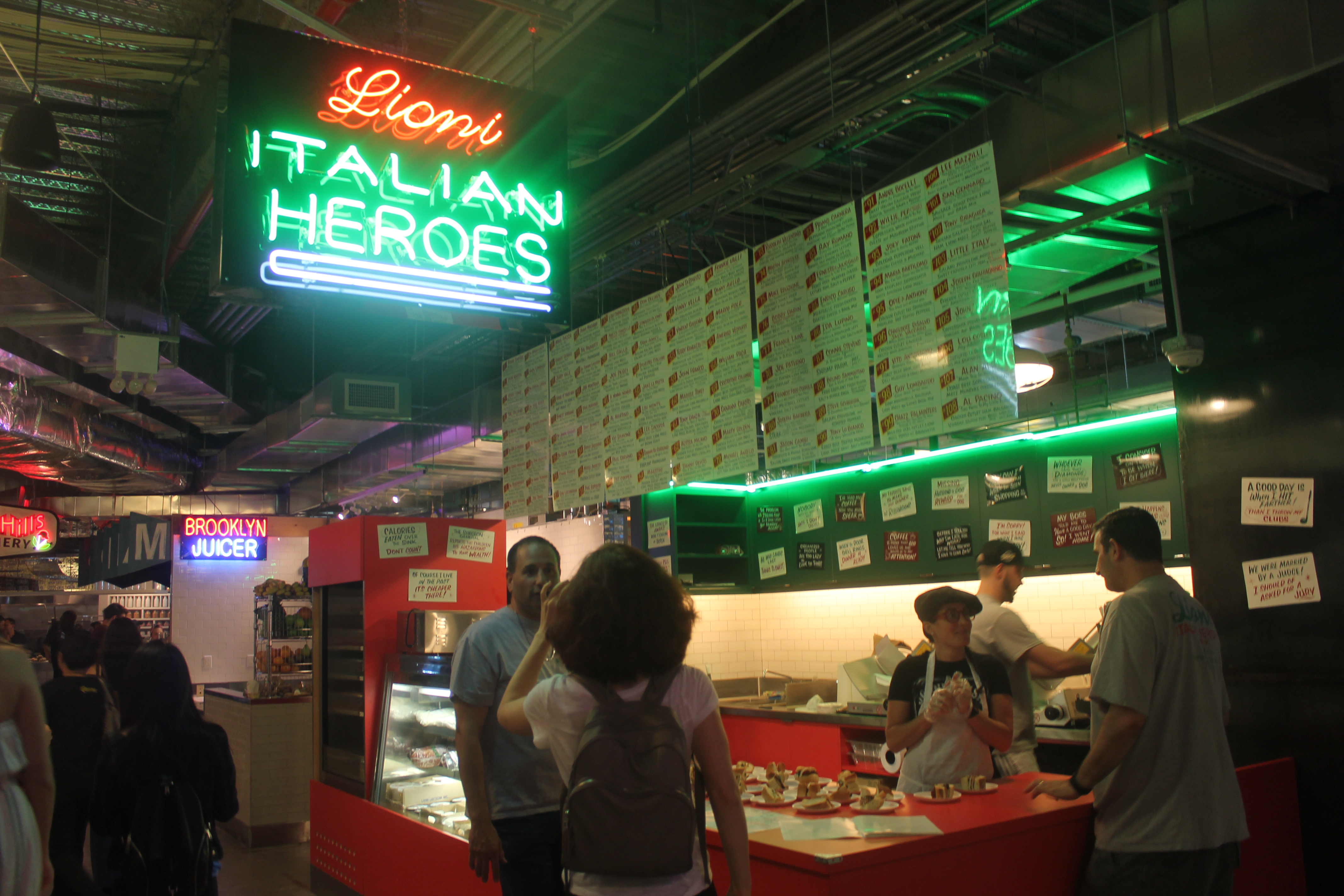 The 40 booths are each individually designed to reflect the character of the goodies being purveyed, and also dynamically arranged in a sort of angled grid, so that there are surprises around every corner, some really well-known (think heavy hitters like Katz’s Deli, Ample Hills Creamery, Fletcher’s BBQ and Bensonhurst’s own Lioni Italian Heroes) and others relative newbies like the amazing Kotti Berliner Doner Kebab (whose marinated chicken is extraordinary), Pierogi Boys and BK Jani, which serves up flavorful Pakorey (vegetable fritters) and Chicken Tikka among its offerings.