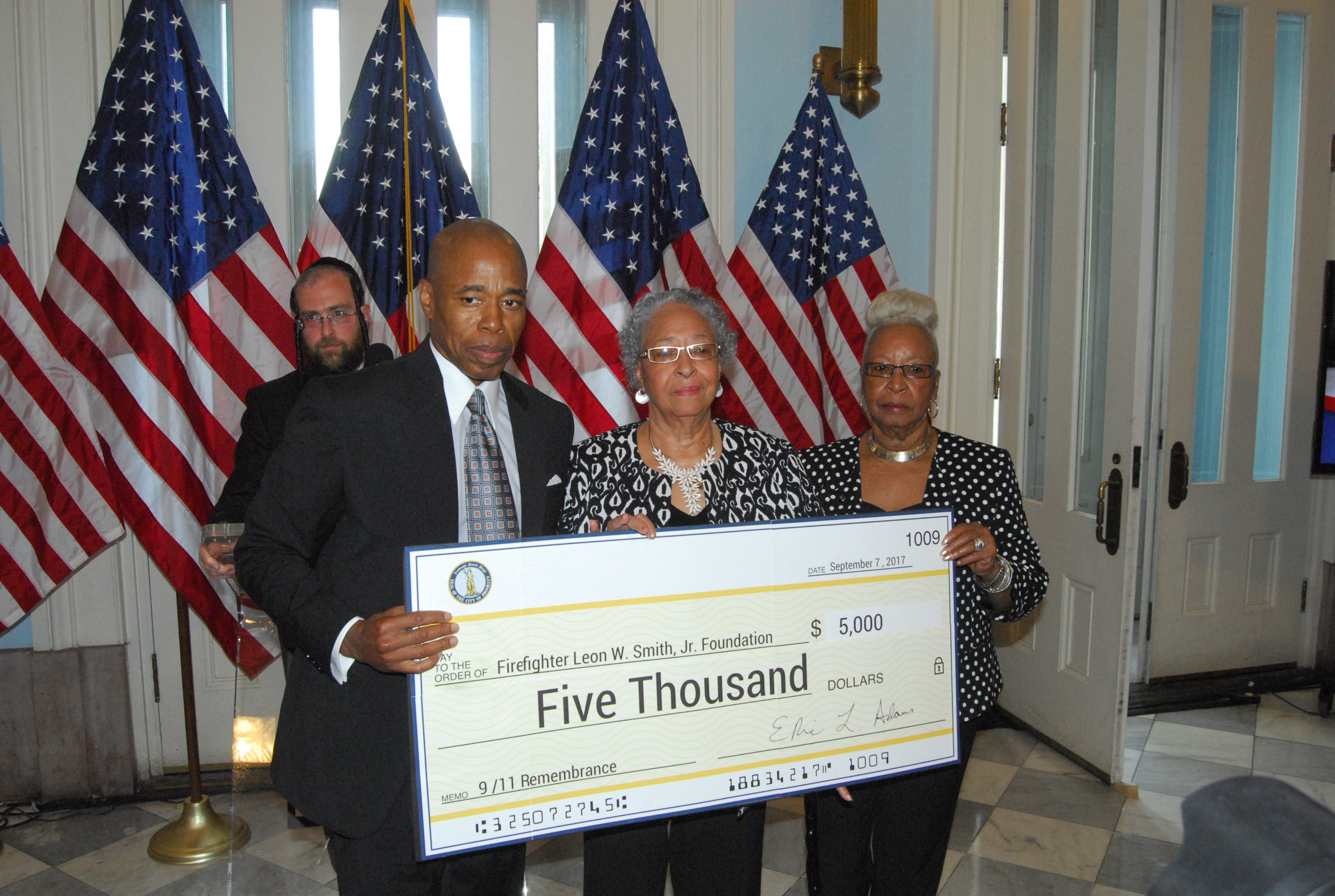 Adams presented a check to the Leon W. Smith Jr. Foundation, named after firefighter Leon W. Smith, Jr., who tragically lost his life saving others on that fateful day.