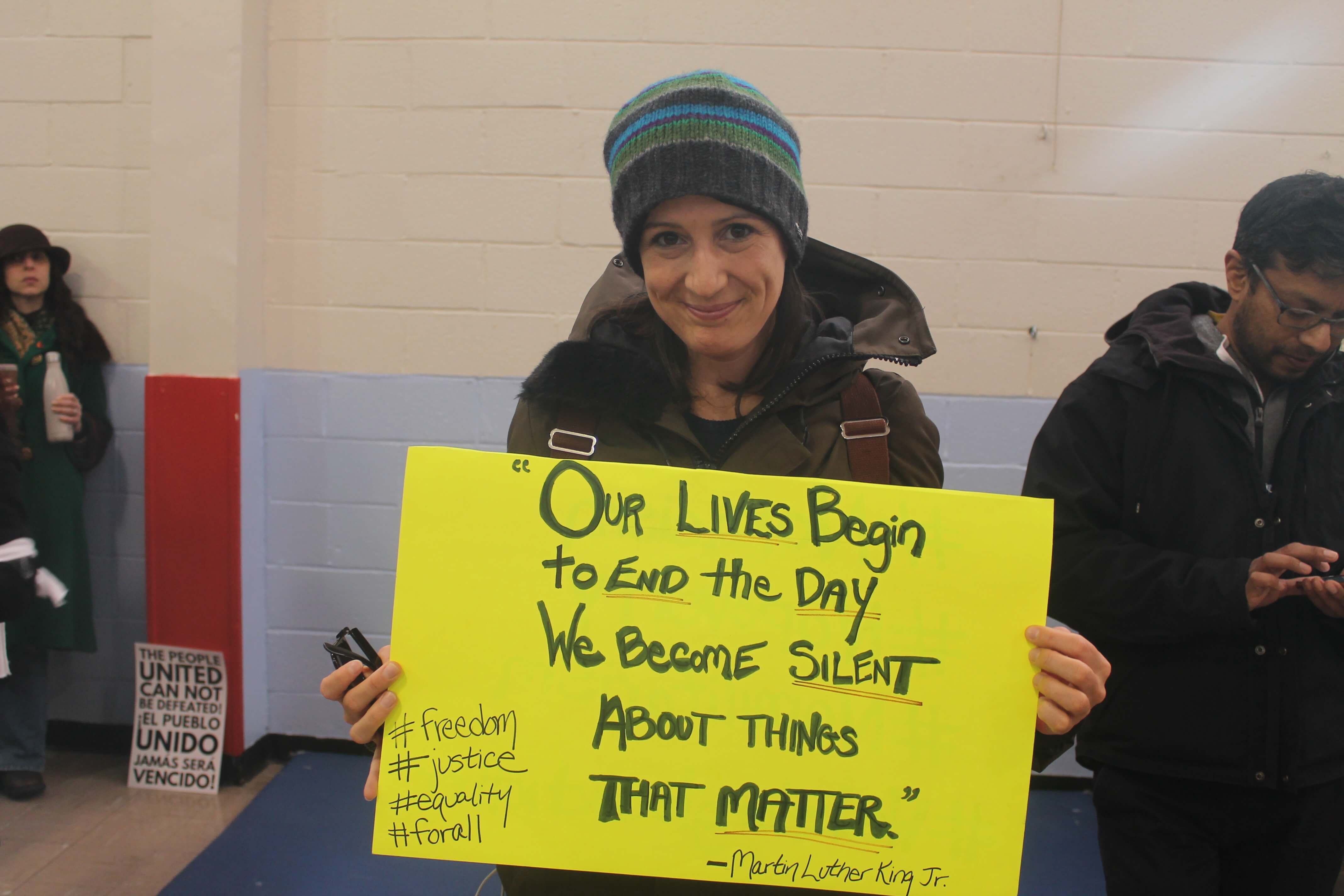Lisa Darling, a Carroll Gardens resident, held a sign that quoted King that read, “Our lives begin to end the day we become silent about things that matter.”