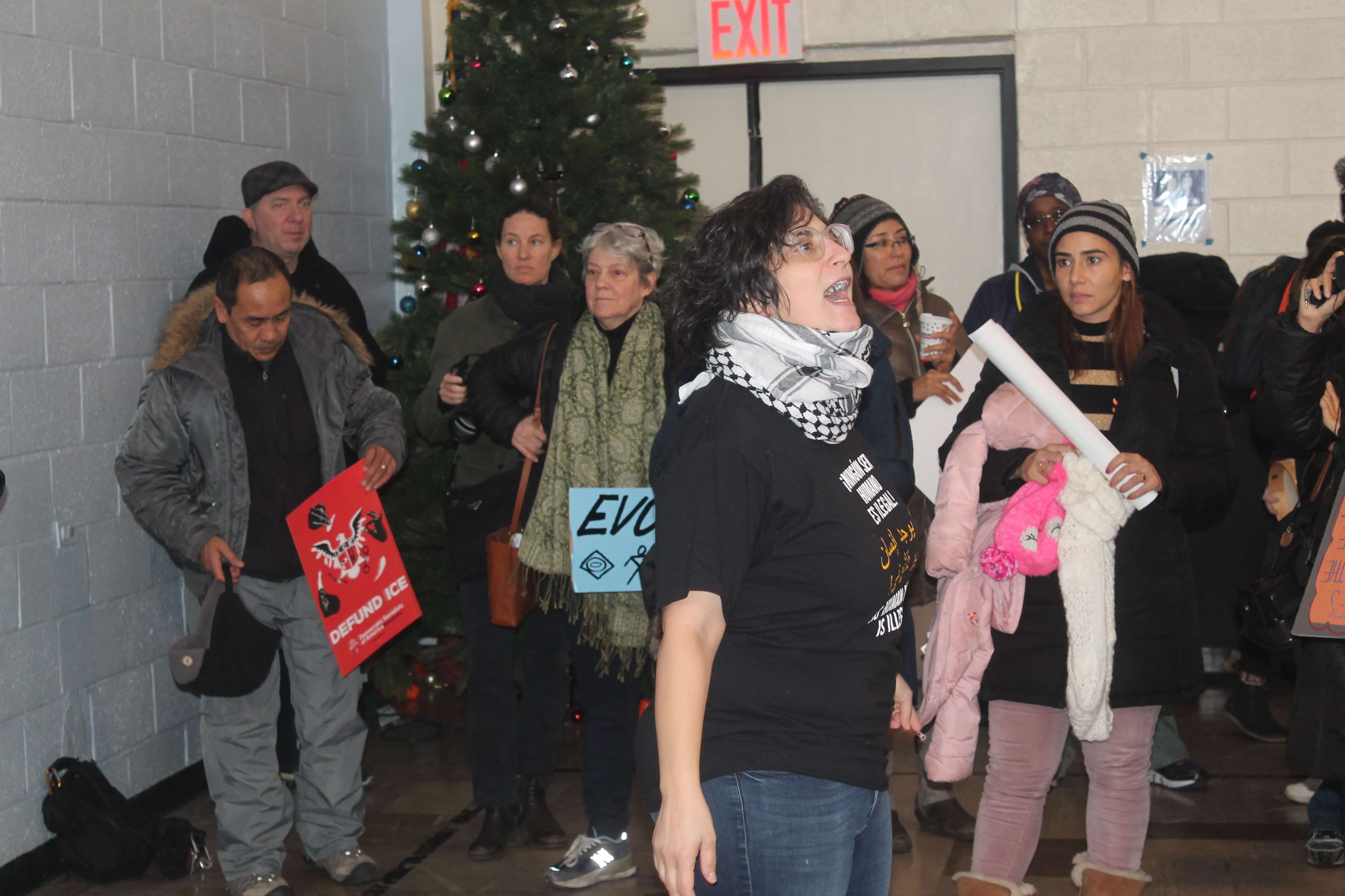 Bay Ridge political activist Linda Sarsour addressed the marchers before they went outside.