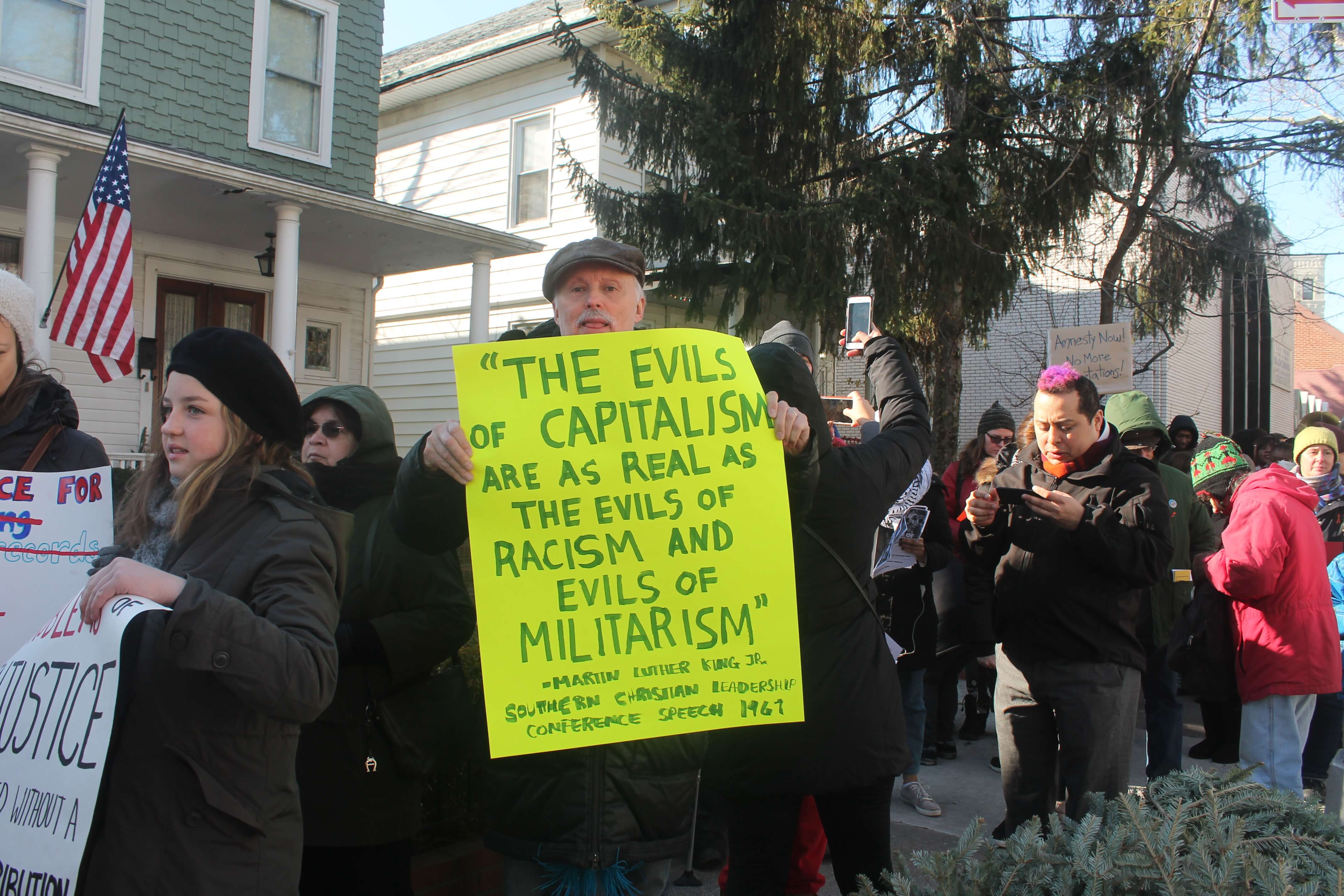 “This is what democracy looks like” was one of many chants heard in Bay Ridge on Dr. Martin Luther King Jr. Day, as hundreds of people marched through the neighborhood in solidarity against racism, poverty and militarism.