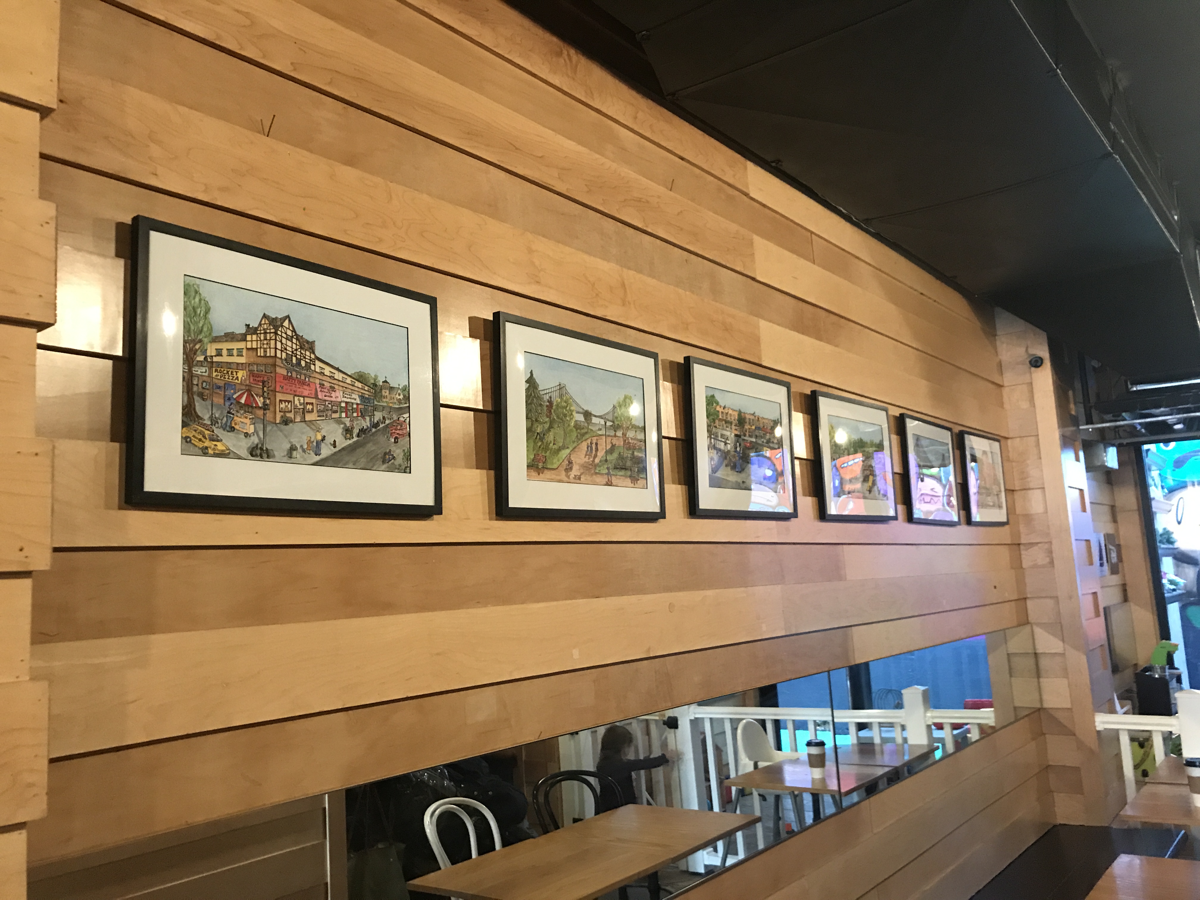 Degener is no stranger to the Coop, or to Ridge-inspired artwork. Last November, the local artist had her second solo show at the coffee shop in which she spotlighted some of her best portraits of Brooklyn – among people’s favorites, a reimagining of Fifth Avenue’s own Pizza Wagon.