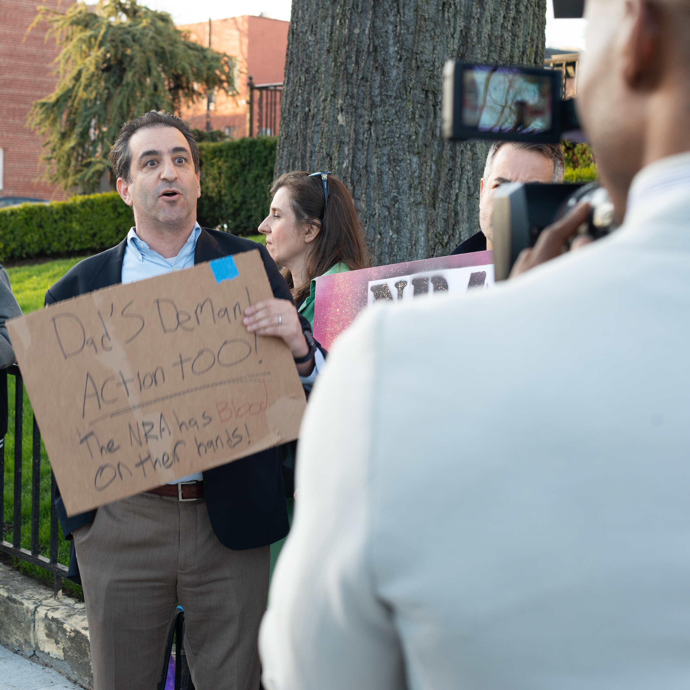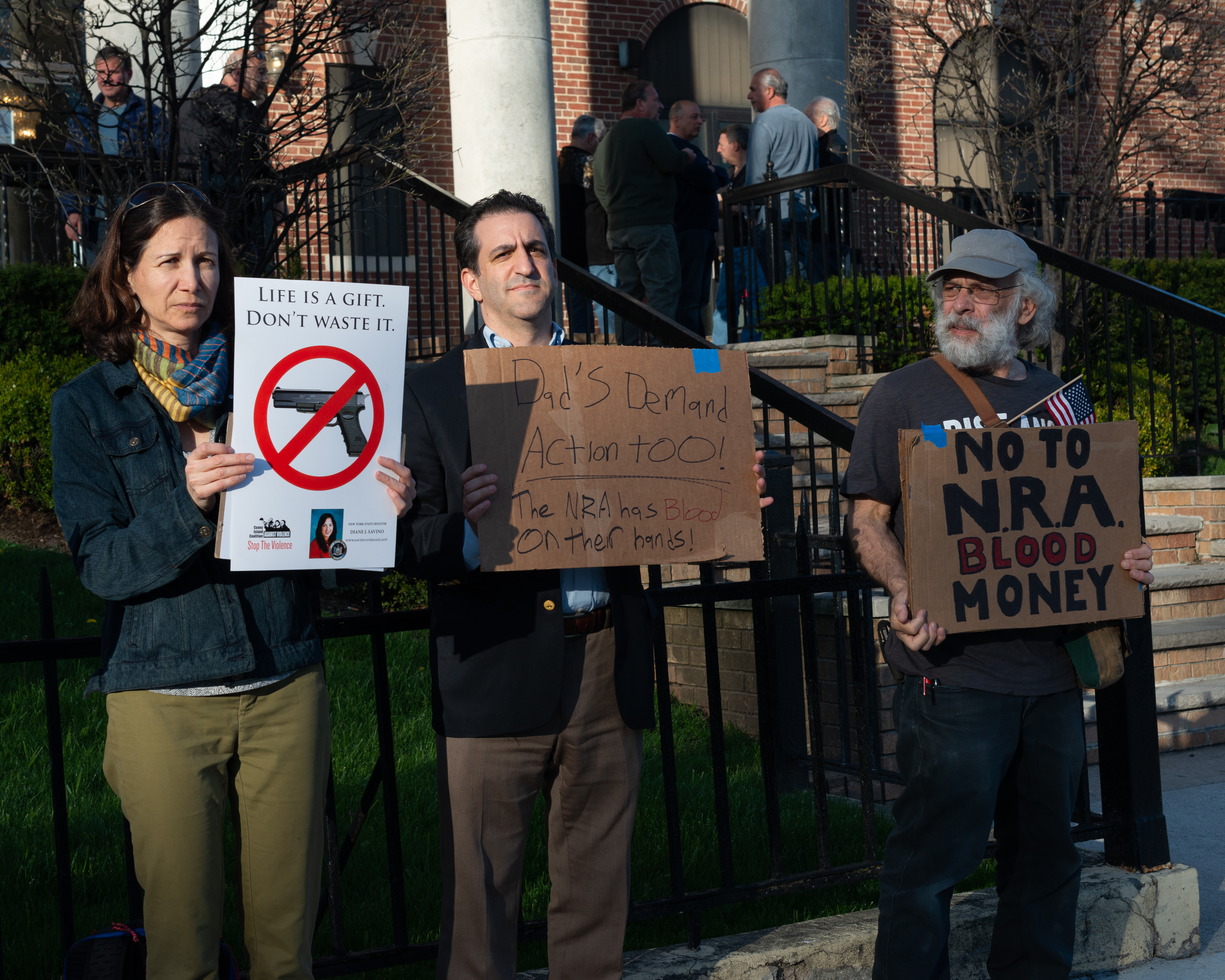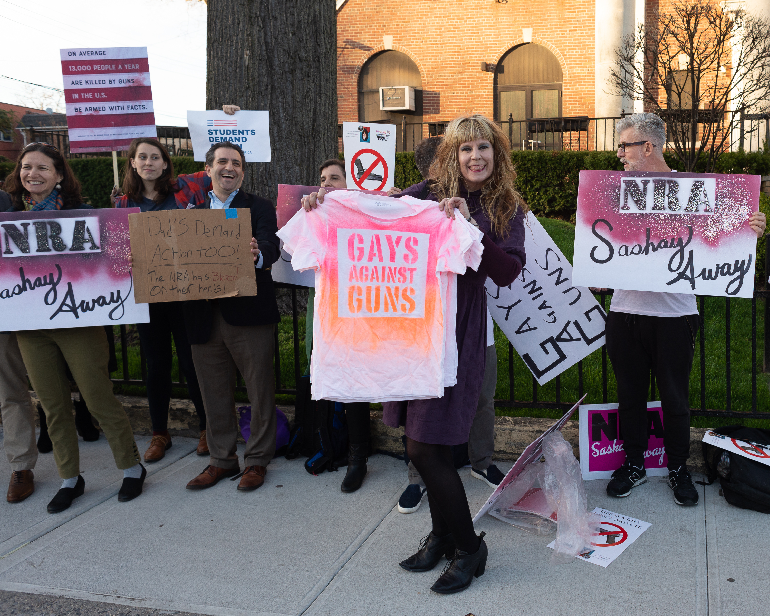 Holding such signs as “NRA, Sashay Away” and “Dads Demand Action Too,” a crowd of about a dozen protesters from groups such as Gays Against Guns, Rise and Resist, the Coney Island Anti-Violence Collaborative and Moms Demand Action for Gun Sense in America showed up outside the K of C, 13th Avenue and 86th Street, to let the roughly 100 attendees inside know where they stand.
