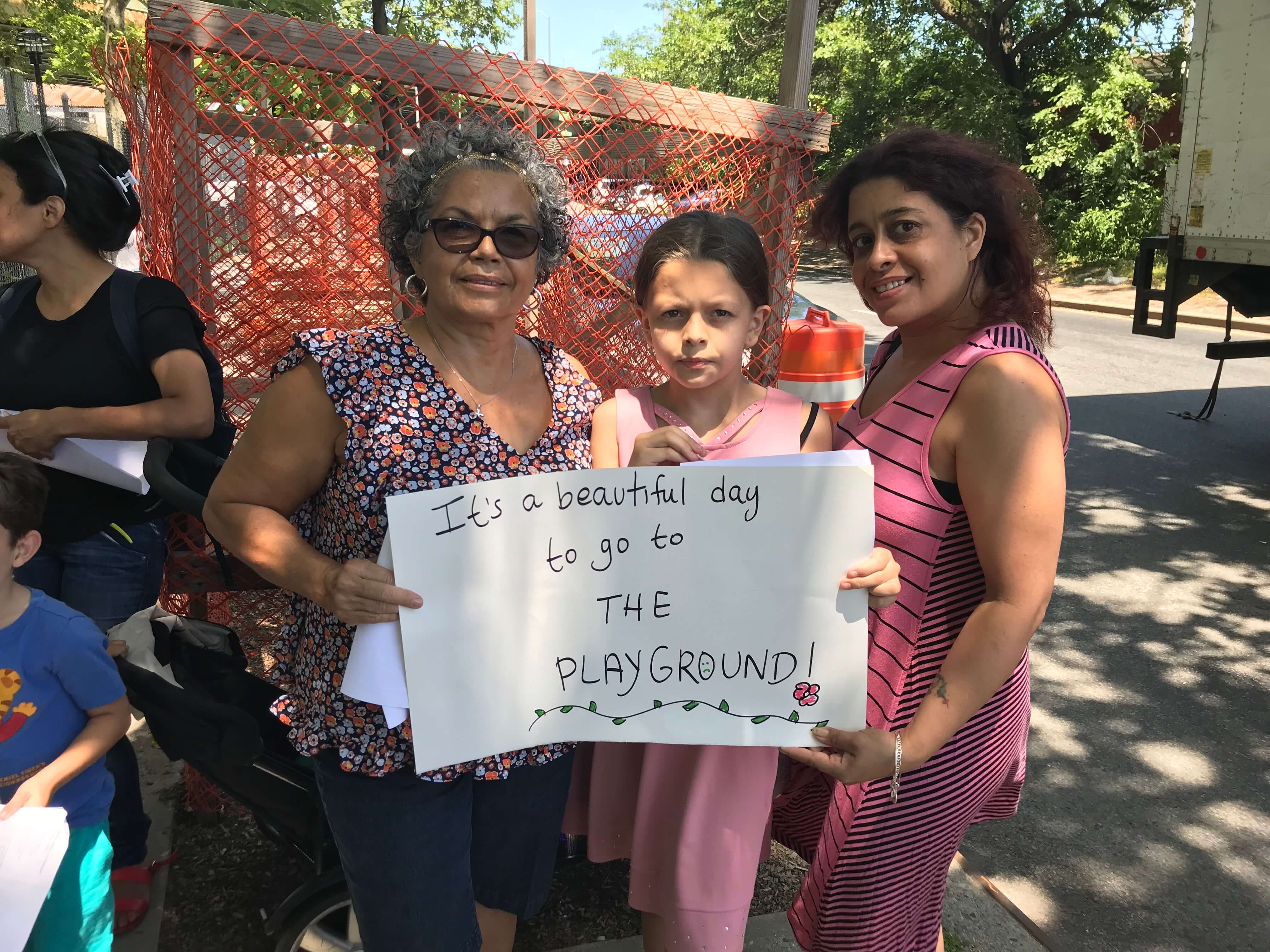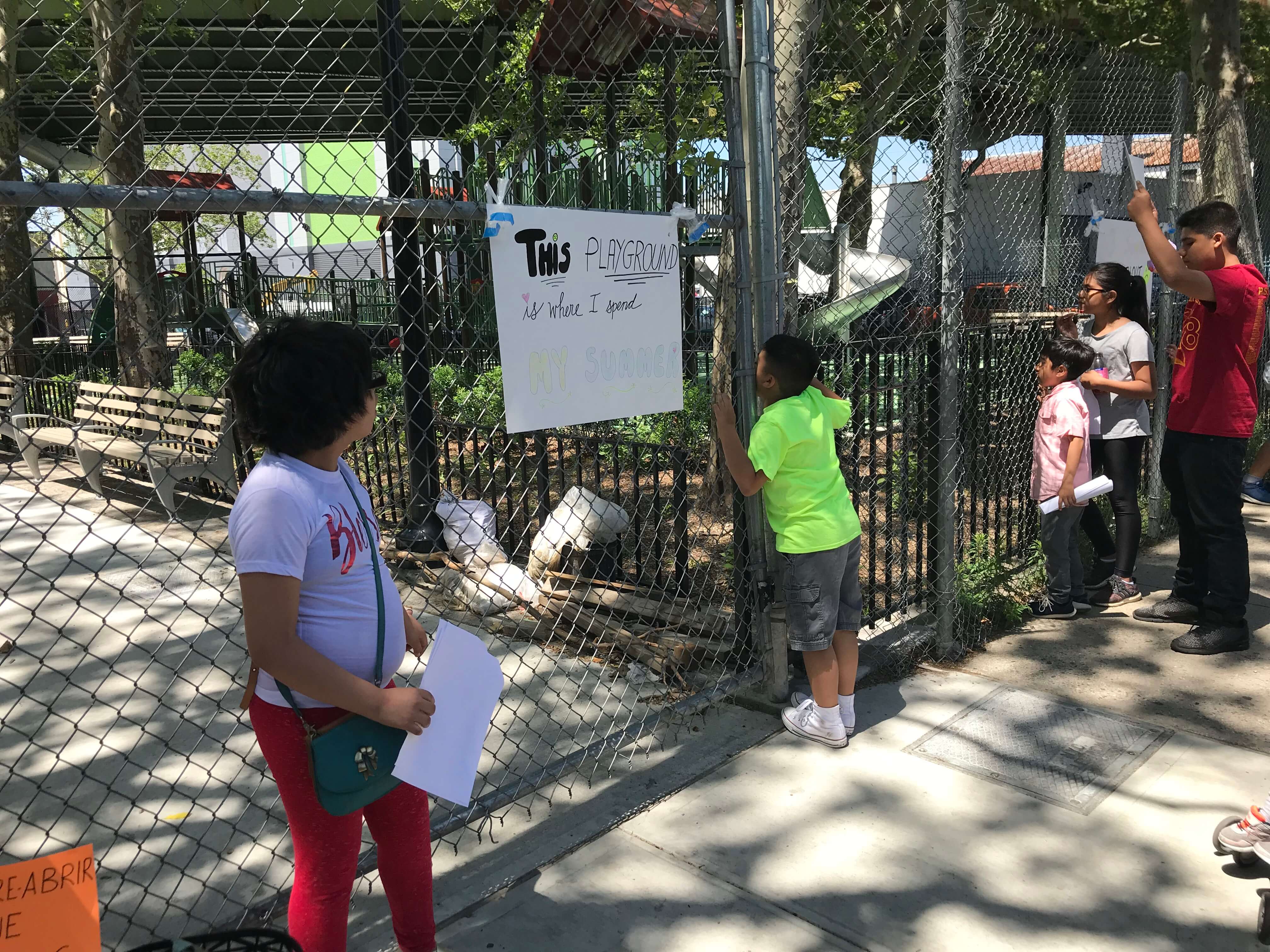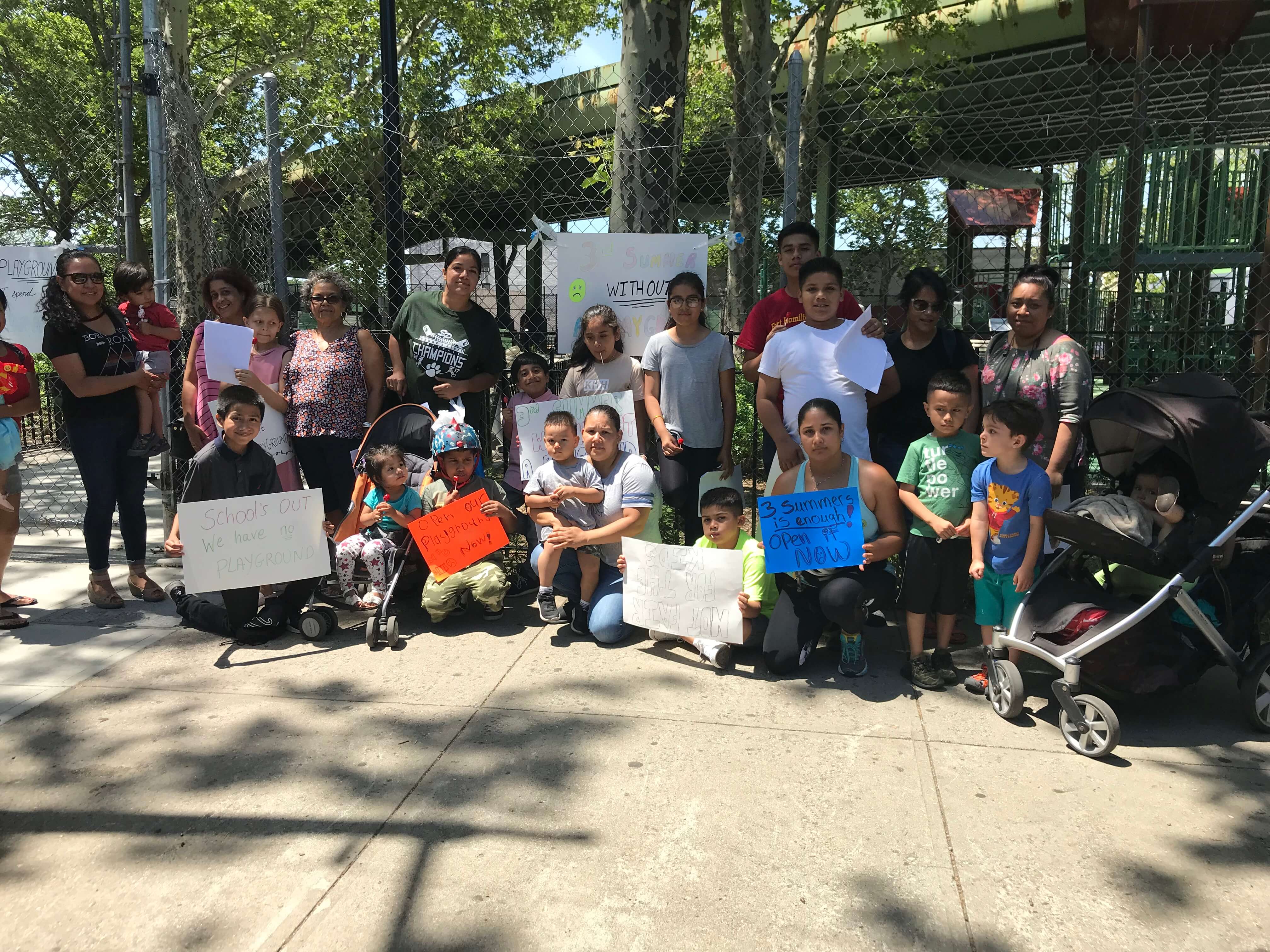 Dozens of parents and their children showed up outside the gated John Allen Payne Park Playground on Third Avenue between 64th and 65th Streets on Tuesday, June 26, upset that the renovation of the space has taken so long and demanding that the city open it in time for summer now that school is officially out.