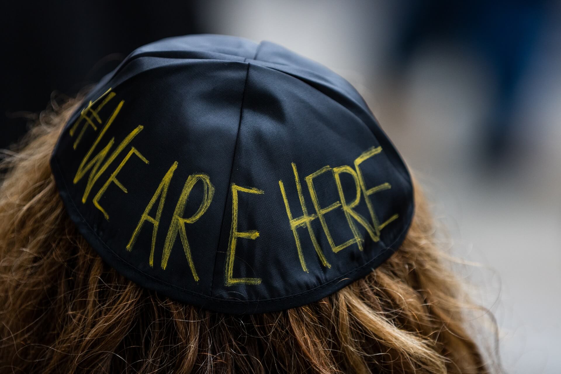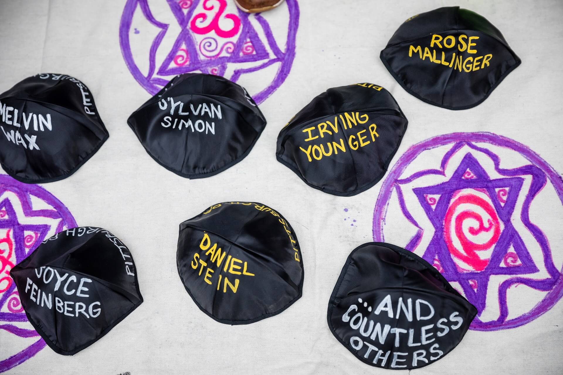 Eleven yarmulkes, each bearing the name of a victim gunned down in the Tree of Life synagogue in Pittsburgh on Oct. 27, were placed on a banner on the ground in front of Golden’s office at 7408 Fifth Ave. Many of the protesters wore T-shirts with the slogan #EndWhiteNationalism. Several participants were wearing yarmulkes bearing another slogan: #WeAreHere.