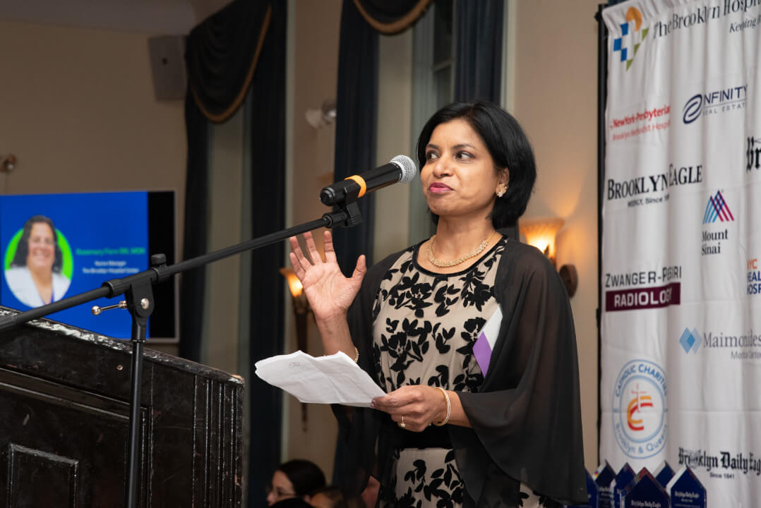Gary Terrinoni, president and CEO of The Brooklyn Hospital Center, congratulated Kondamudi on her award. “I’d like to congratulate honorees Vasantha Kondamudi and nurse manager Rosemary Fiore. If you were to ask me who would be the best representative of the Brooklyn Hospital Center now and hopefully in the future it would be those two individuals.”