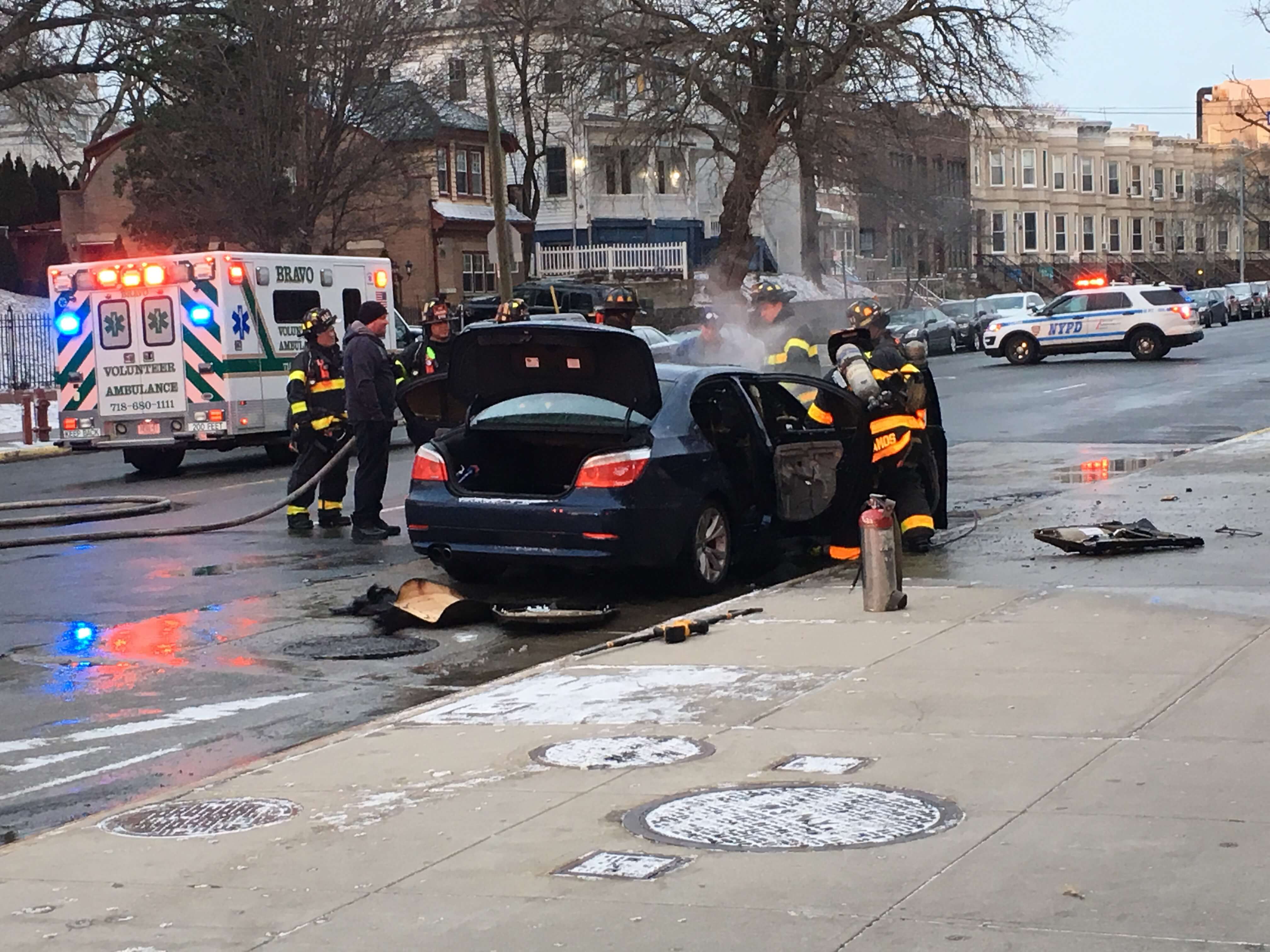 A vehicle caught fire in front of P.S. 185 Walter Kassenbrock at 8601 Ridge Blvd. in Bay Ridge Wednesday at approximately 5 p.m.
