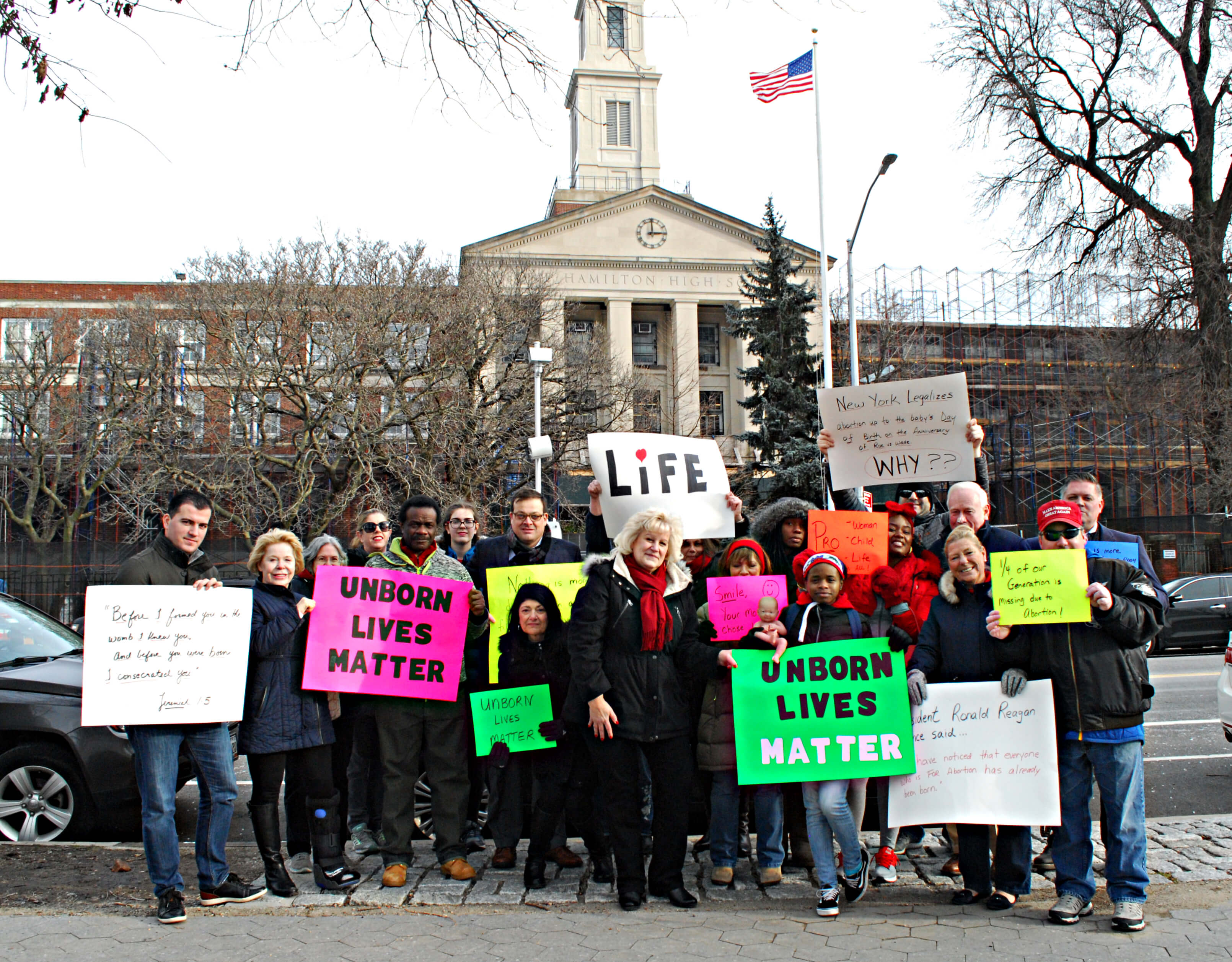 “More than 50 people stood against New York’s abortion expansion law & the removal of assaulting a pregnant woman from the State’s penal code this afternoon on Shore Road, across the street from the inauguration of one of the bills co-sponsors @agounardes,” one of the protesters, John Quaglione, wrote on Twitter.