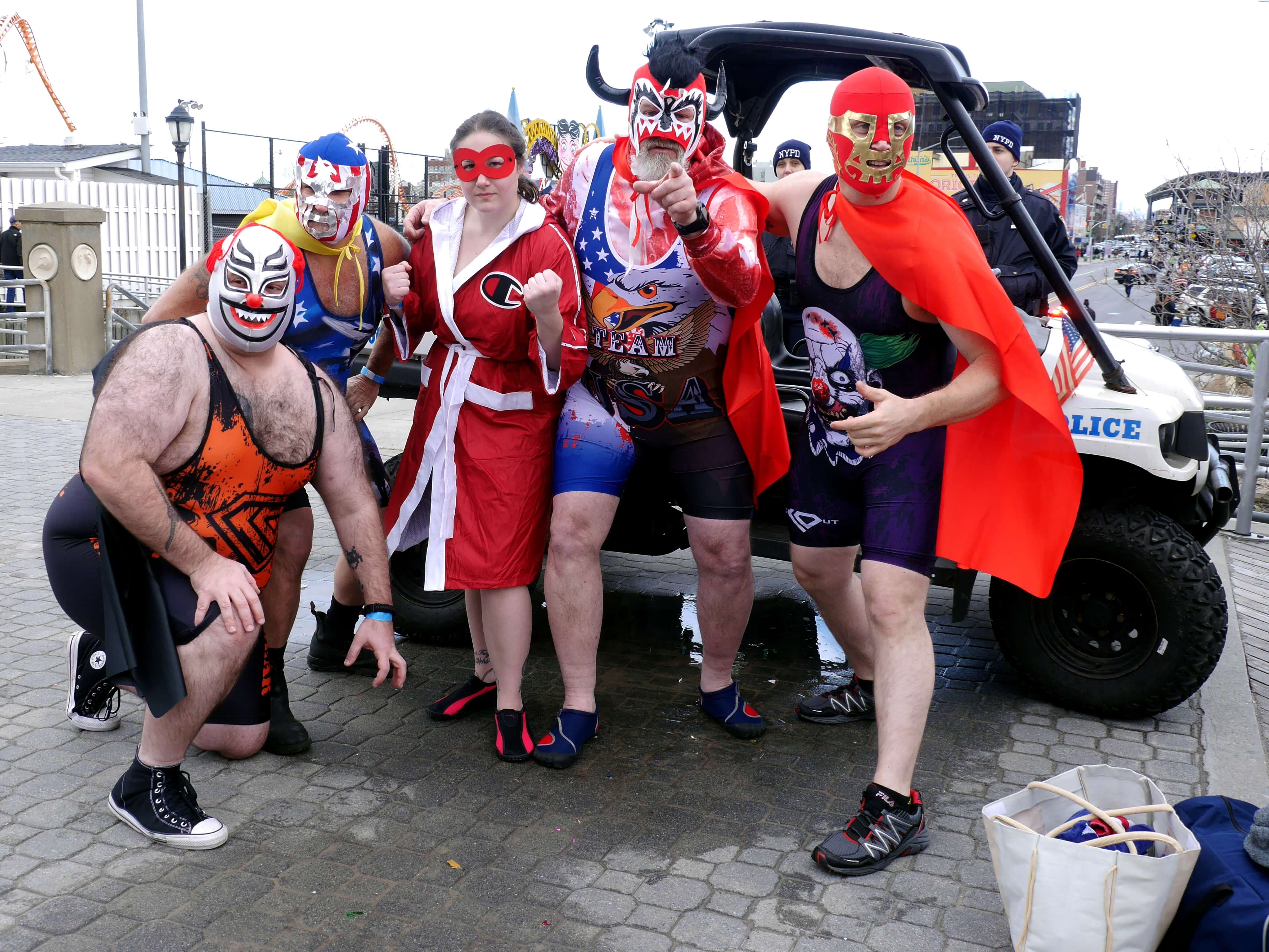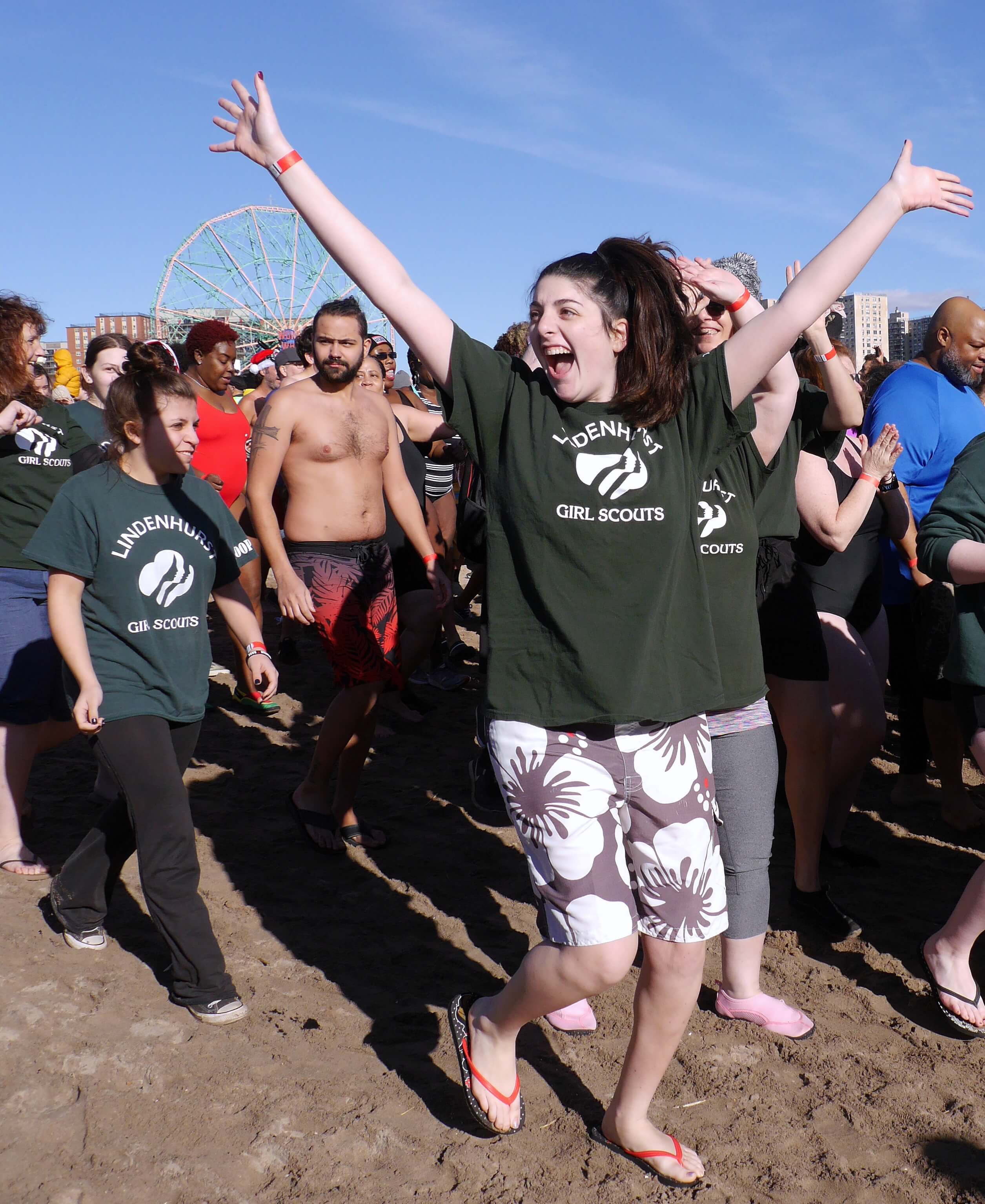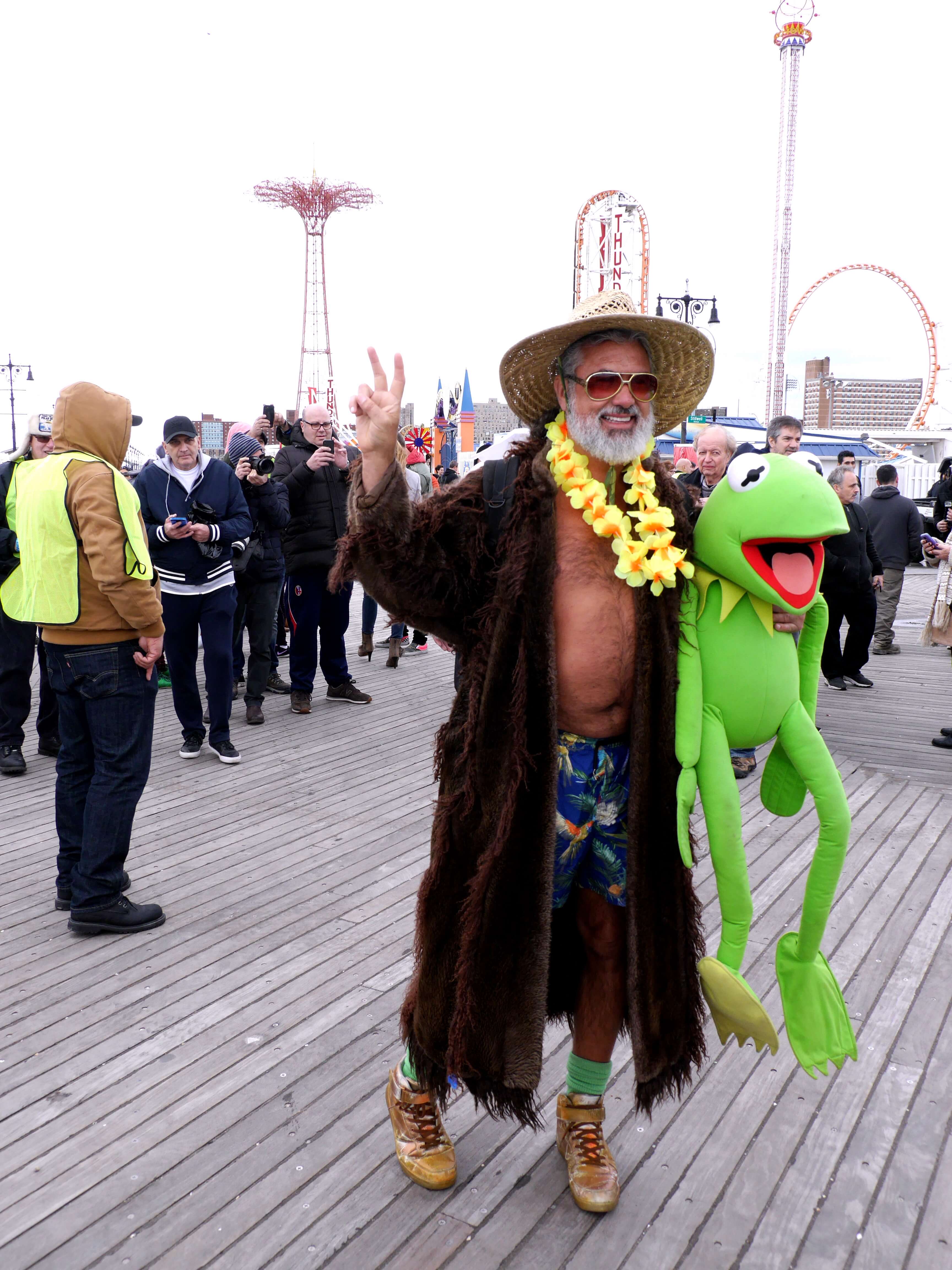 Some hardy souls were dressed in colorful swimsuits and headwear, while others brought their pets along for the plunge. There were revelers of all kinds including dancers, drummers and puppeteers, along with representatives from the Girl Scouts of America and other organizations.