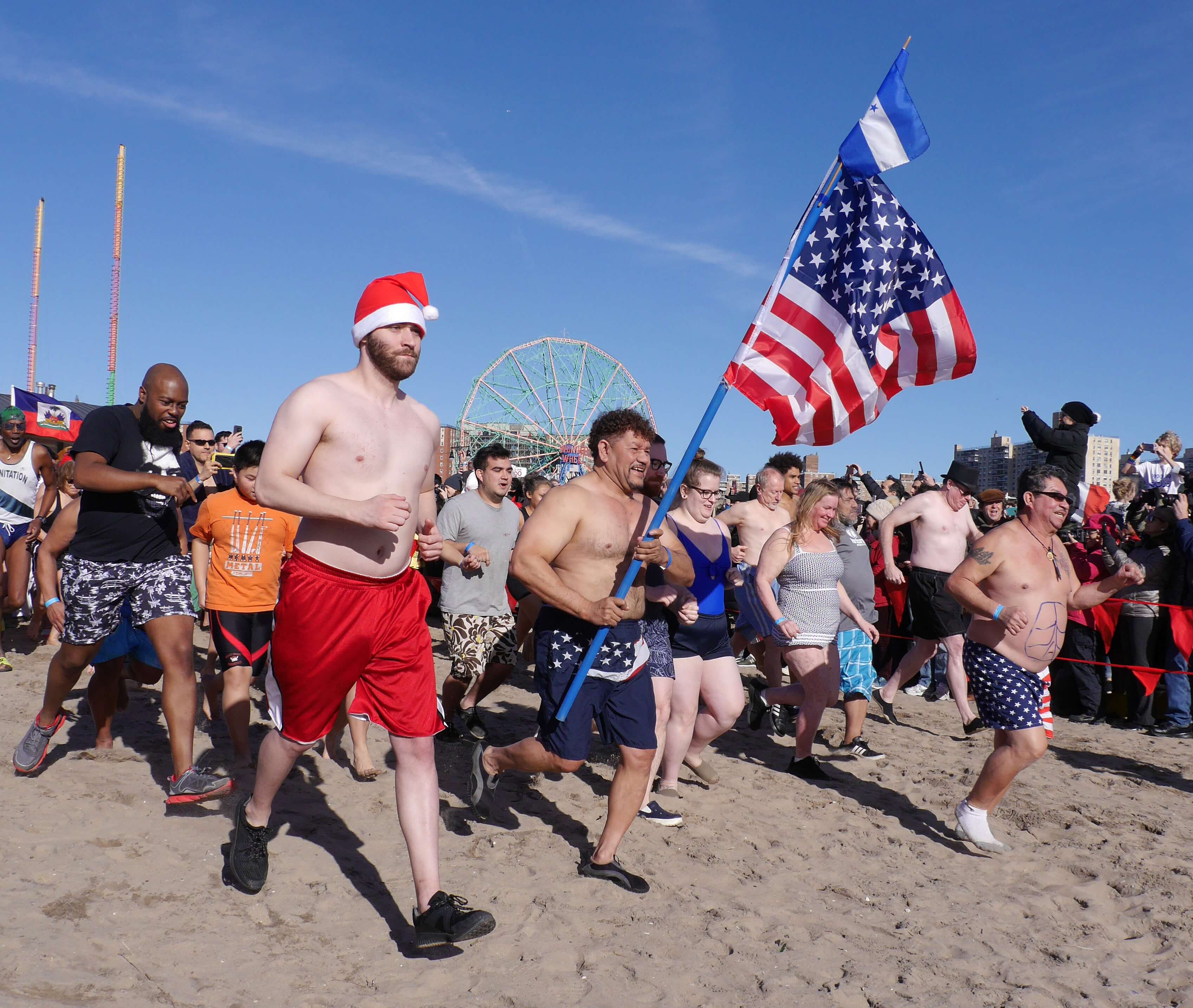 Roberto Velazquez proudly carried the American flag into the surf, while the drum band Fogo Azul NYC kept a steady beat as the polar bears lined up at the starting line for the signal to begin.