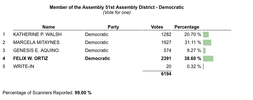 As of 2:15 a.m. on Wednesday, June 24, Ortiz had the lead in the four-person race. According to the Board of Elections in the City of New York, Ortiz had 38.17 percent and 2,305 votes. Marcela Mitaynes, who was endorsed by U.S. Rep. Alexandria Ocasio-Cortez, was in second place with 31.11 percent (1,927 votes). Katherine Walsh was in third with 20.70 percent (1,282) and Genesis Aquino was in fourth with 9.27 percent (547).