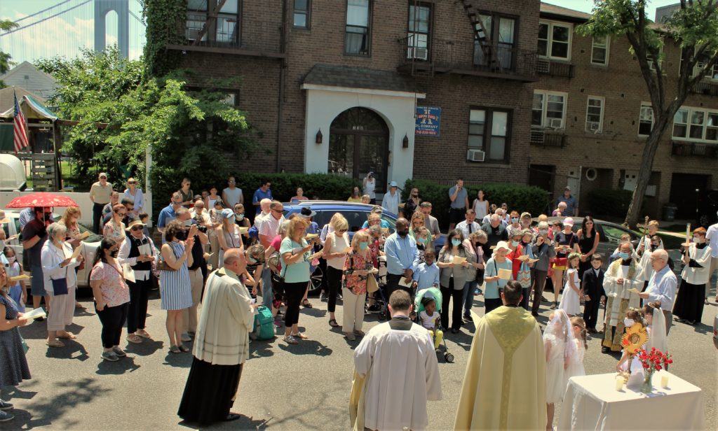 St. Patrick’s Catholic Church in Bay Ridge commemorated the Holy Feast of Corpus Christi – the Solemnity of the body and blood of Jesus Christ – on June 6 with a somber procession on the streets near the church. A member of the clergy carries a gold-plated monstrance containing a Eucharistic consecrated host, and stops are made at small outdoor pop-up altars set on the sidewalks near the middle of each street. Here is where the priest incenses the monstrance, prays and reads from the Gospel.