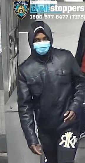 The suspect is a dark-skinned man in his 20s, around 6 feet tall with a medium build. He was last seen wearing a blue face mask, black hoodie jacket and black fitted pants with the letters “RKF.”