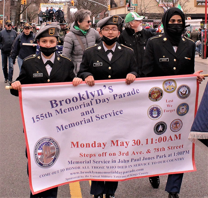 The traditional Memorial Day parade route is along Third Avenue up to Marine Avenue, then along Fourth Avenue to 101st Street. Junior ROTC cadets from Fort Hamilton H.S. help display the patriotic group’s banner.
