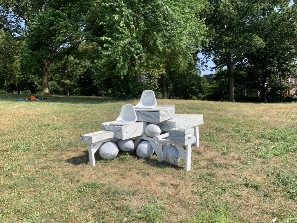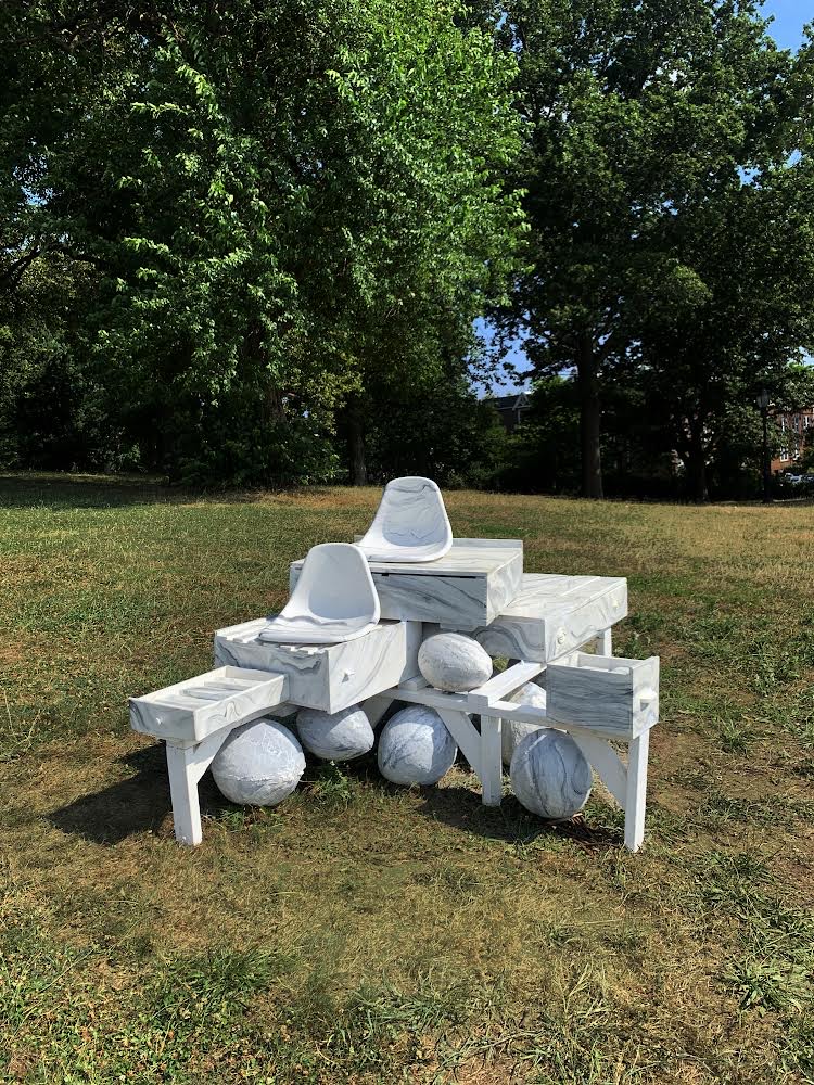 The exhibit has a faux-marble effect to give makeshift rafts built from household furniture the elegance and substance of a marble sculpture.