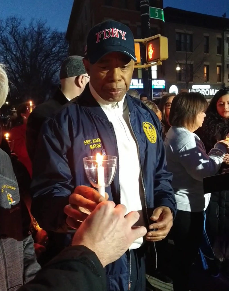 Mayor Eric Adams joined local leaders, residents and the victims’ family members on Fifth Avenue and Bay Ridge Parkway, where deliveryman YiJie Ye, 44, was fatally injured while riding his e-bike Feb. 13.