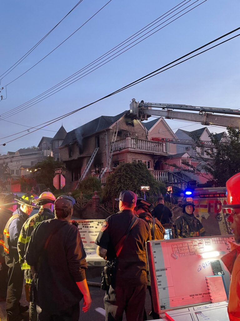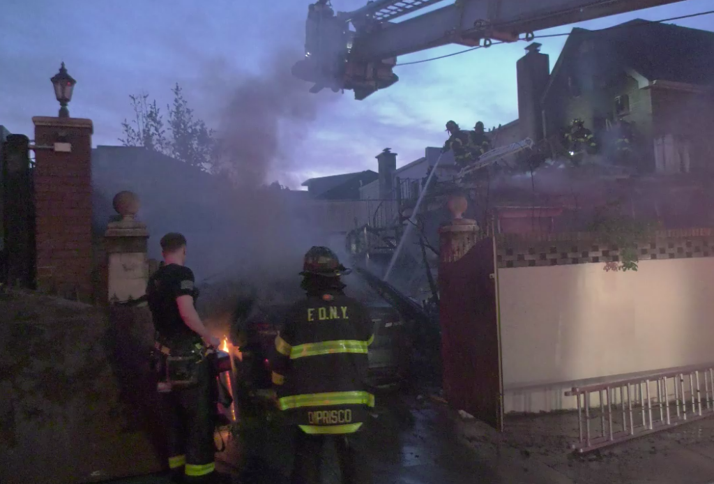Two firefighters sustained minor injuries Sunday while battling a three-alarm blaze in a house on 12th Avenue and 85th Street, according to CBS News.