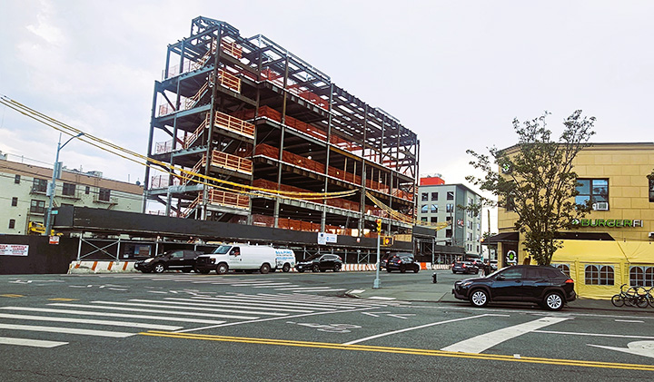 If you walk or drive past the old Nathan’s Famous site on Seventh Avenue and 86th Street, you can view five floors of steel beams and cement flooring that form part of the superstructure of I.S. 322.