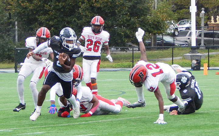 Still within reach of tying the game with six minutes to go, Farley marched his team to midfield until his pass was blocked for another interception. Starting at the 40-yard line, Smith handed off on a series of plays to Cassius Fraser until he finally crossed the goal line to make the final score 30-16 for Boys High’s second win of the season.