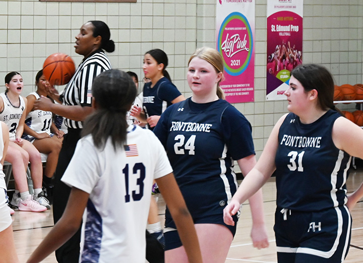Led by St. Edmund’s high scorer Julia Walsh (20 points), the Eagles took a 15-9 first quarter lead that increased to 21-15 by the half. Through the efforts of Fontbonne high scorers Erin Murtagh (15 points) and Emma Bevaqa (14 points), the Bonnies made a third-quarter comeback, outscoring the Eagles 9-8 to narrow the score to 29-24.