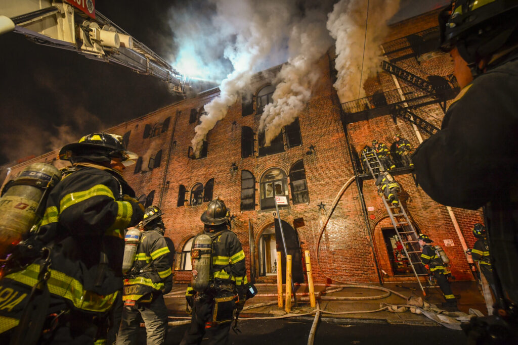The blaze started at 11:25 p.m. and climbed to a fifth-alarm fire by 2:30 a.m. with 200 firefighters on scene as flames shot through windows of the 19th-century-built warehouse.