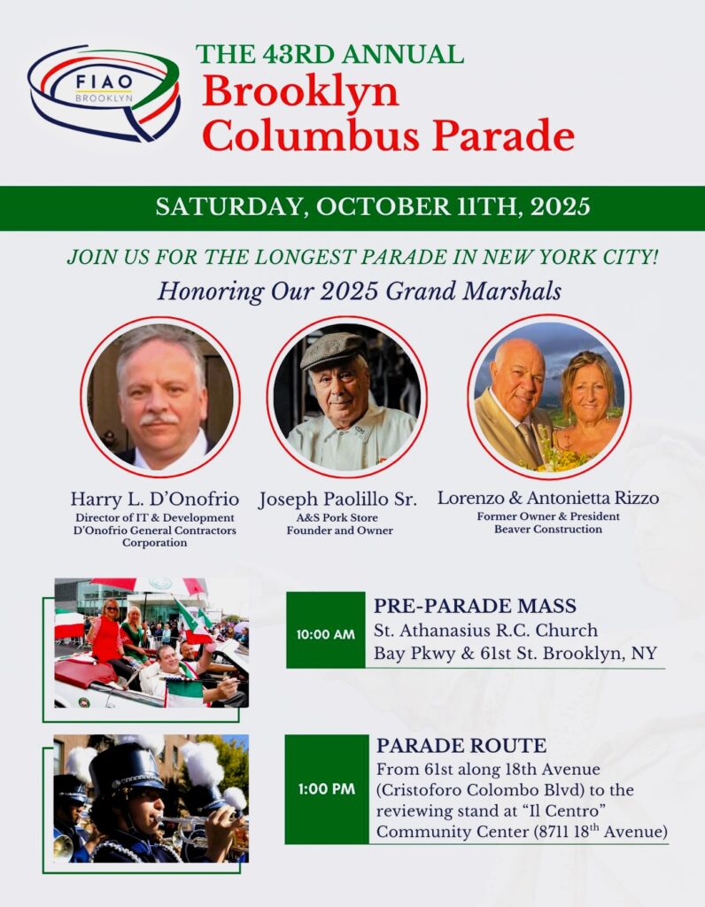 On Sunday, Oct. 5 at 11:30 a.m., FIAO will hold a fund-raiser for its 43rd annual Brooklyn Columbus Day Parade Signature Brunch at Russo’s on the Bay in Queens. This event will also honor the grand marshals and scholarship recipients.