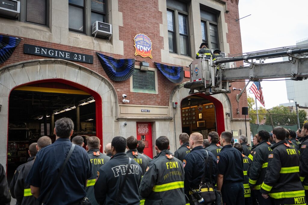 The following day, FDNY members placed purple and black bunting on the exterior of FDNY Ladder 120, 107 Watkins St., where Brady served. On Nov. 11, FDNY gathered for his dignified transfer.
