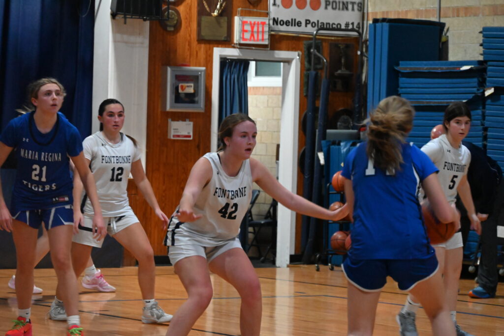 The third quarter was the turning point as Maria Regina adjusted to Fontbonne’s zone defense to go on a 26-11 run by draining six 3-point baskets by three different players. Instead of attempting to penetrate Fontbonne’s perimeter, Emma Yankers-Talz (18 points) sank three 3-pointers, Emma Carey (17 points) sank two and Brielle Boggio (13 points) sank one to give Maria Regina a 48-39 third quarter lead.