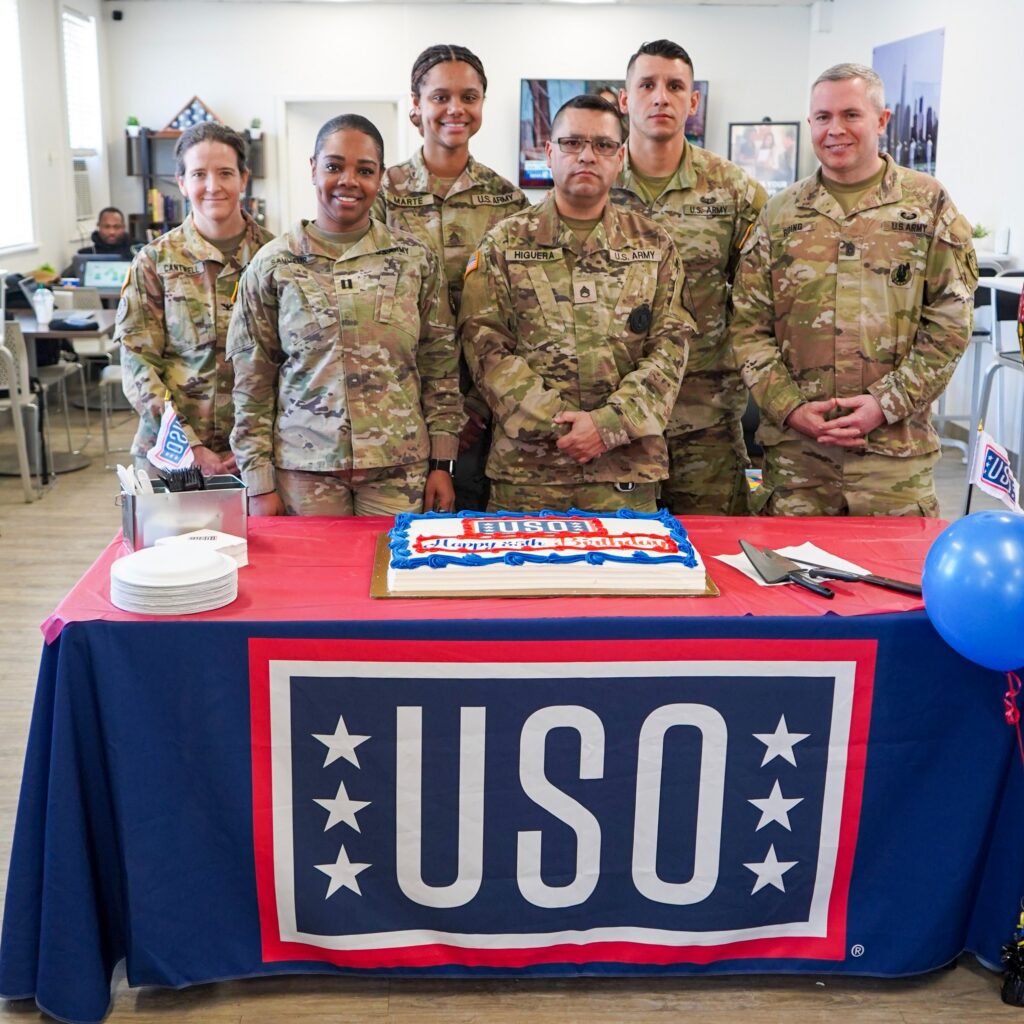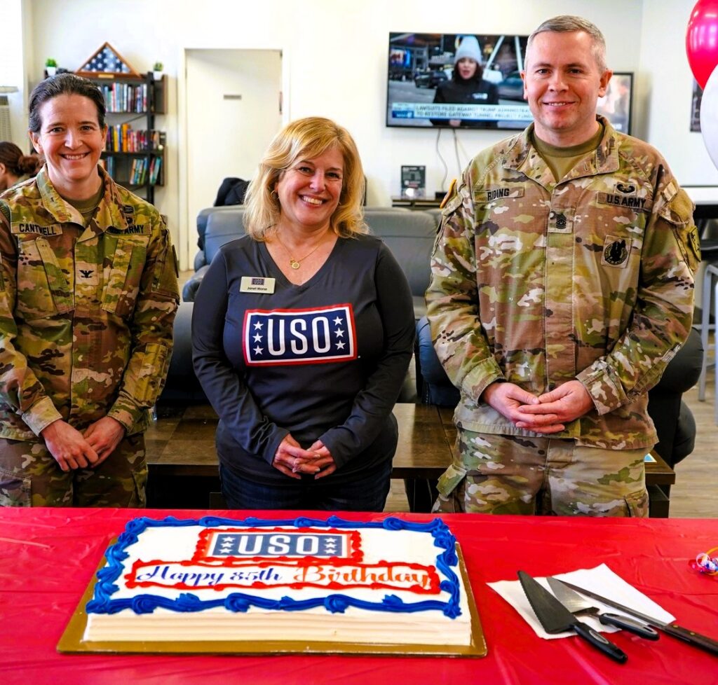 U.S. Army Garrison Fort Hamilton Commander Col. Melissa Cantwell, Garrison Command Sgt. Maj. Eric Riding and soldiers assigned to the NYC Recruiting Battalion at Fort Hamilton celebrated the USO’s 85th birthday on Feb. 4 at the USO Center with Janet Morse, area operations specialist with USO Greater New York.