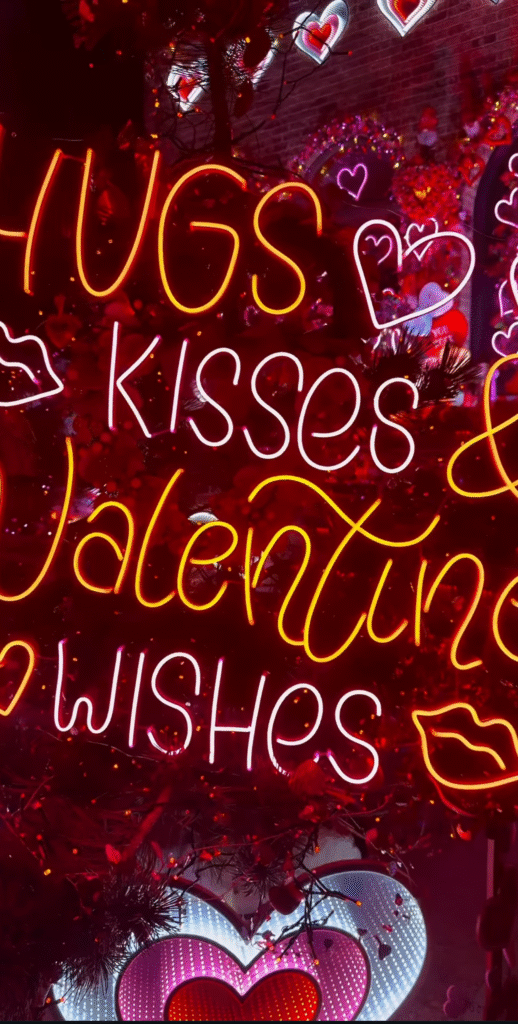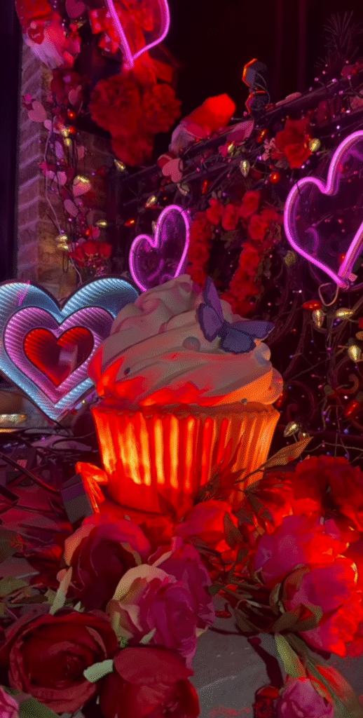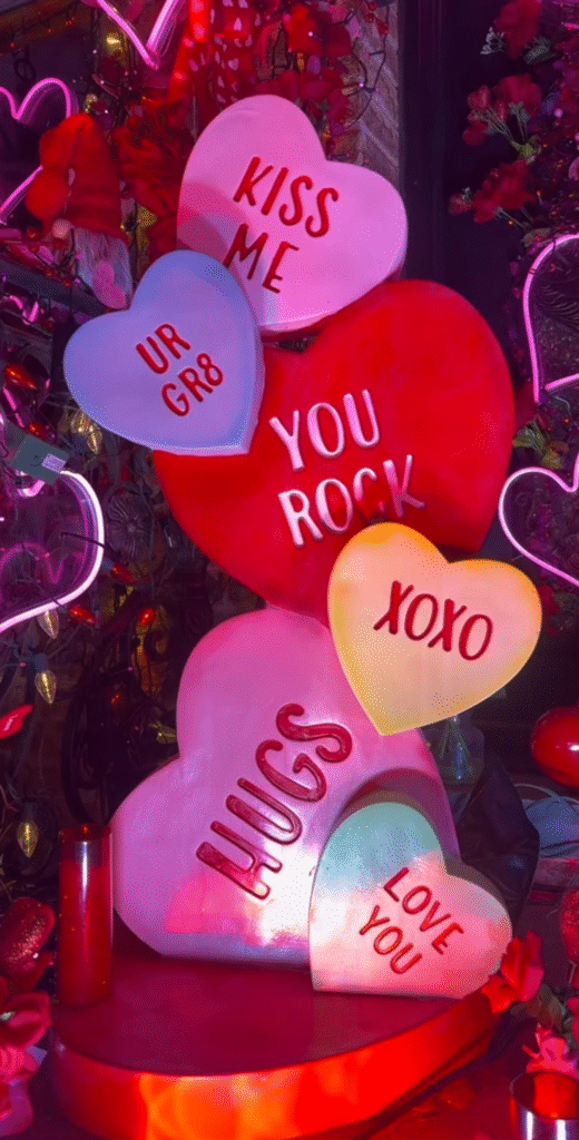 Along with lots of neon hearts, decorations include a replica of a giant cupcake and candy with romantic messages, a red chair and more.