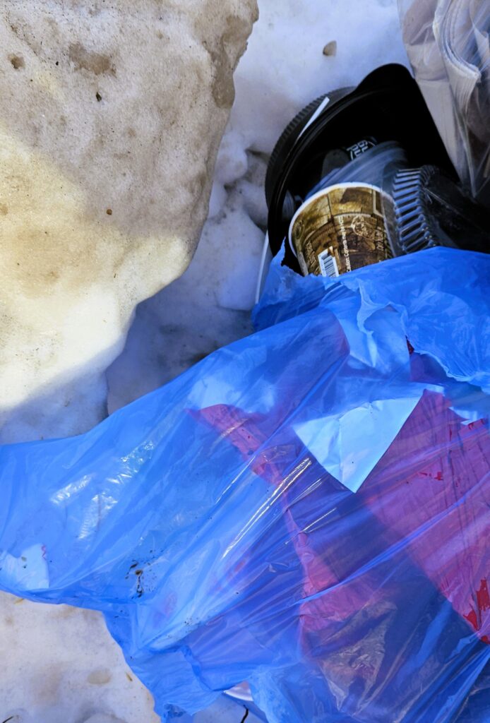 However, apparently some of these rebel collectors couldn’t care less, and simply open the recycling bags, take what they want and then dump the rest of the contents loose into the bins. I had just returned from an appointment and found another recycling bag torn apart and the refuse scattered on part of the sidewalk.